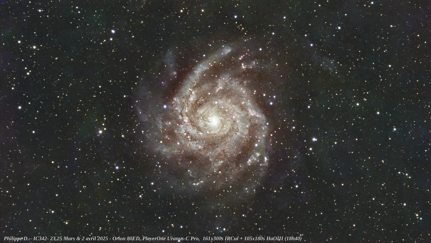 Bonjour, Alors je vais commencer par remercier @keymlinux @Tromat et @Ant-1 pour mon histoire de halos jaunes, mais sans oublier non plus vous tous pour tous vos conseils precedents Je me suis donc entete à sortir cette IC-342 a peu pres proprement avec pour objectifs: - de sortir des tons roses traditionnels - Les bras blanchâtres - sans halos jaune (même si la marque des halos reste, je n'ai pas le niveau pour les supprimer totalement ou les reduire plus) - en révélant au mieux les IFN sans être trop marqué - sans les couleurs discos dont je suis coutumier Le coeur reste un peu cramé, j'ai encore des artefacts, et surement d'autres points a améliorer mais la version est la et je pense avoir beaucoup appris dans ce petit challenge J'ai tout repris à zero depuis les stack, avec un tri drastique sur les brutes et un rejet plus aggressif au stack Au final donc reprise de 3 sessions en 2024 (80ED + reducteur artesky x0,8, filtres SVBony pour les 2, Uranus C Pro a -15°c sur HEQ5 Rowan) - 161 brutes de 300s en IRCut conservées - 105 brutes de 180s en Duoband SVBony 7nm conservées - Total 18h40 Bon ciel a tous (le mien devrai enfin commencer a s'eclaicir demain, y a plus qu'a prier que le vent tombe ) Resultat (correction sur la version, mauvais upload precedent)