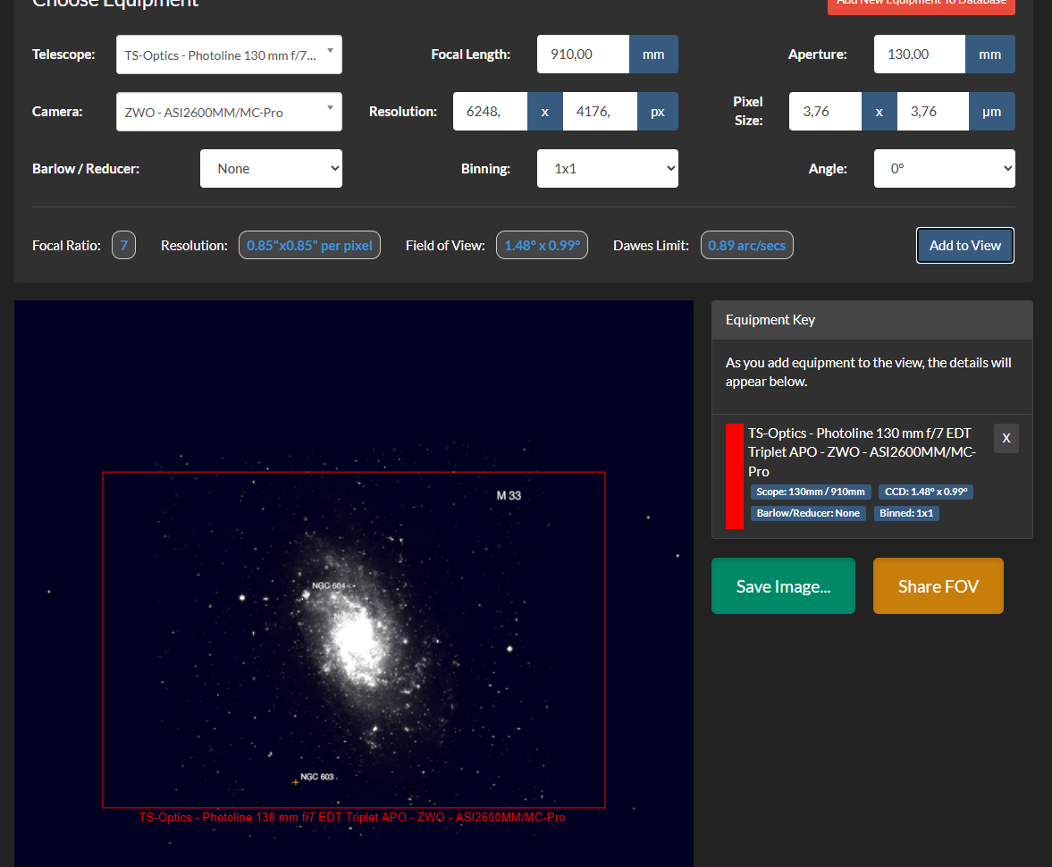Une lunette de 80, c'est super pour faire du grand champ. En plus, tu commences royalement avec une super caméra. Et ta monture est assez costaud pour porter assez lourd. Bref, pour dire qu'une des lunettes les plus vendues, car très complémentaire en focale à ta 810, c'est la 130/910... C'est l'instrument passe-partout que l'on voit un peu... partout, justement Exemple : https://www.teleskop-express.de/en/telescopes-4/apochromatic-refractor-55/all-apos-und-eds-223/ts-optics-photoline-130-mm-f-7-edt-triplet-apo-3-7-focuser-7717 J'en ai longtemps eu une, avant de passer à sa grande soeur la 140, mais de focale identique à la 130 (car idéale pour plein de cibles). De plus, avec ta caméra, le ratio f/d 7 est parfait. La 130 permet 0.89" de résolution et avec la 2600, ça te met à un échantillonnage de 0.85" donc à fond des possibilités de la lunette. Et nickel pour une caméra couleur (on vise 1" pour les cam mono et environ 0.8" pour les couleurs, qui ont un peu de déperdition). https://astronomy.tools/calculators/field_of_view/ -