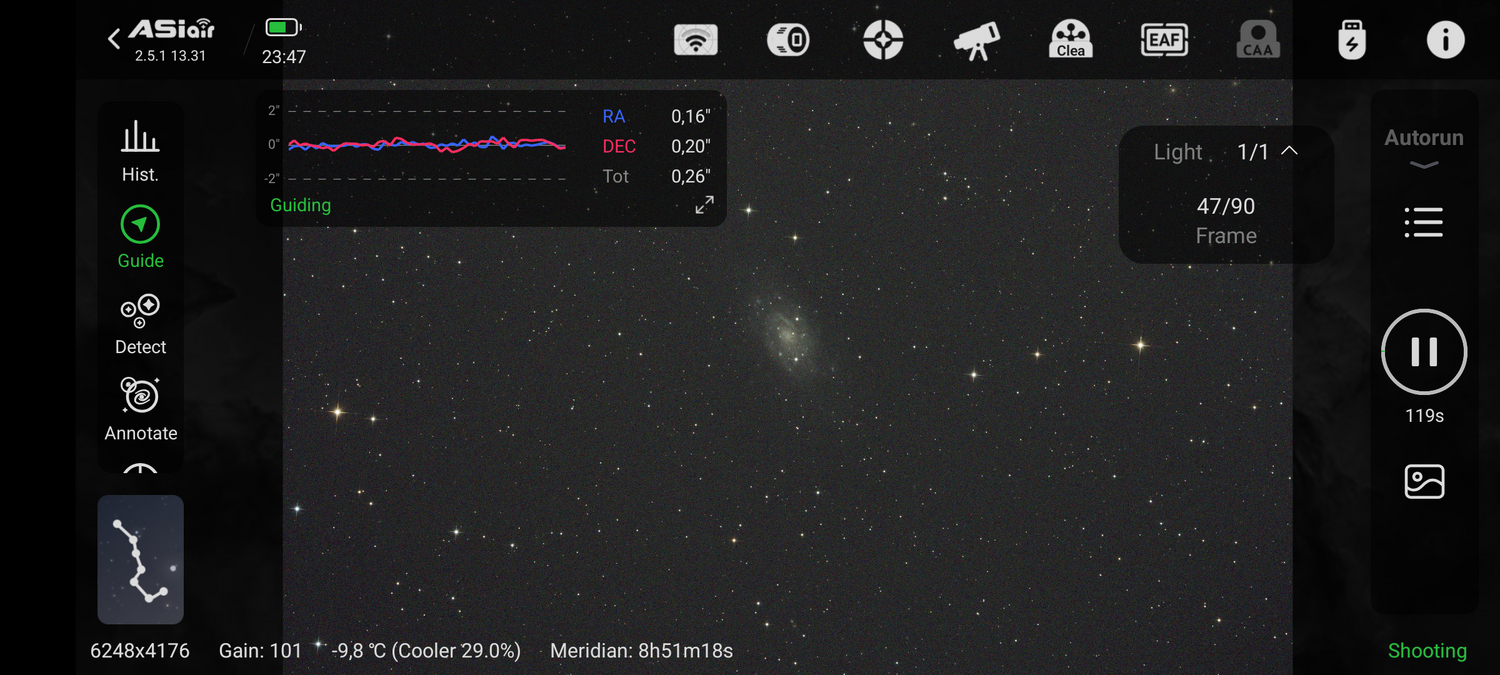 Merci En comparaison, Leo Triplet que j'ai imagé le 19/03 avait une FWHM bien + élevée et un guidage moyen : ça se voit sur la netteté à zoom 1:1
