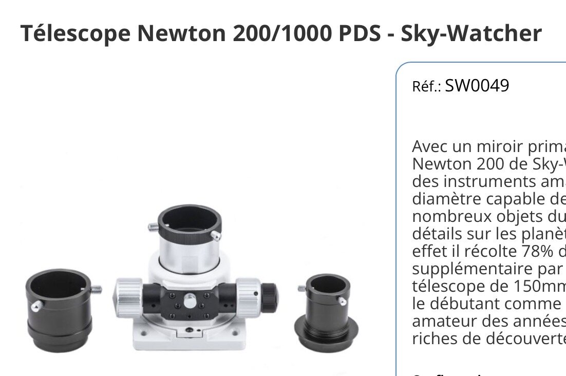 Je ne vais pas investir plus sur ce telescope, je vais nettoyer les optiques et changer les vis de montage, cela fera un très bon instrument pour du visuel. Pour la photo je prévoyais d'acheter un C11, je cherche à faire des galaxies, NP et de la mosaïque des grands objets. L'avantage des C11 est un bon rapport qualité prix et les correcteurs de coma sont vraiment abordables. Merci pour ton aide, Skywatcher707