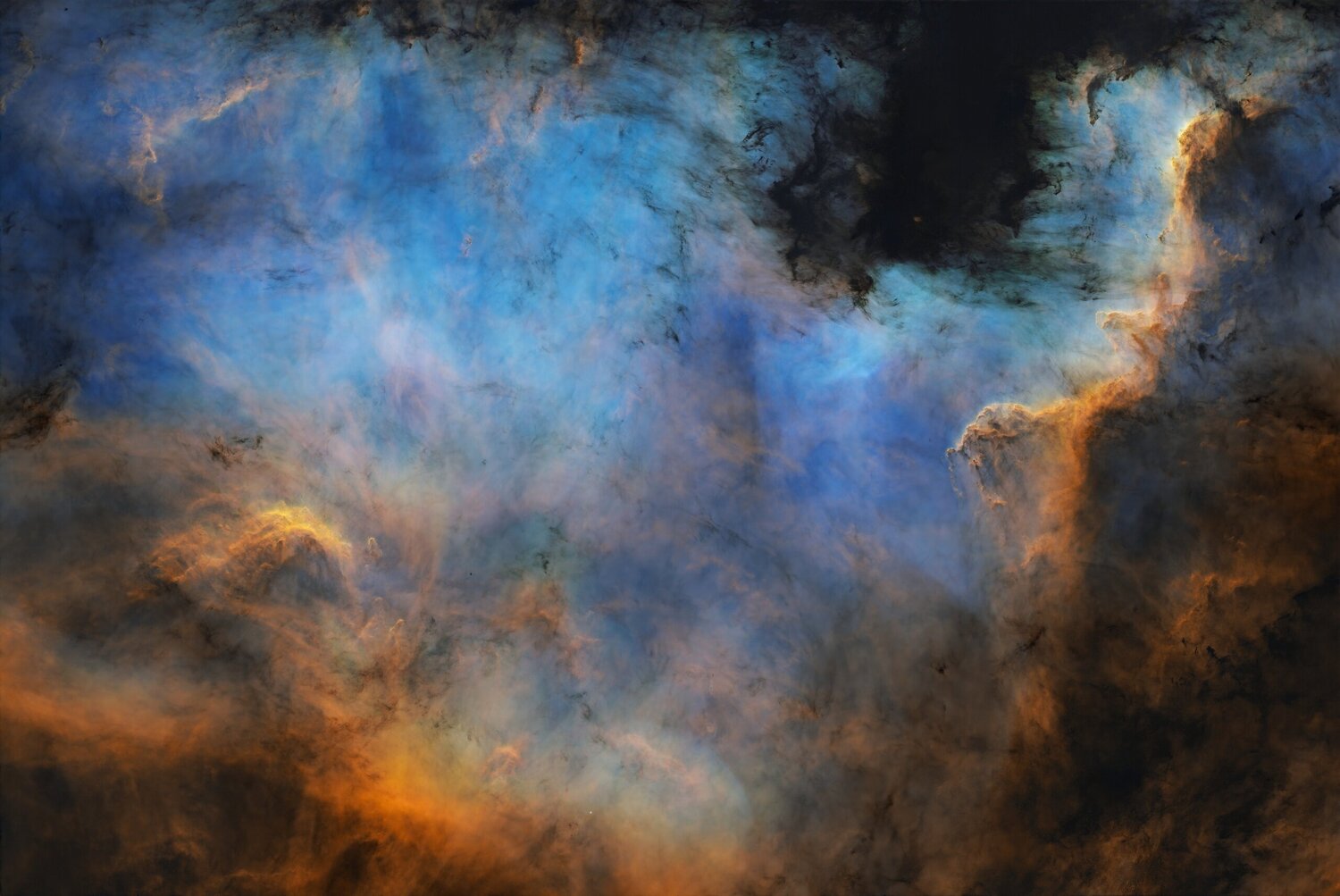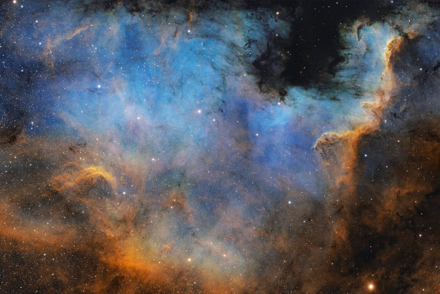 Hello, Voici une image que je n'avais pas encore traitée, mais Valentin oui. C'est maintenant chose faite, donc voici NGC 7000, la nébuleuse de l'Amérique du Nord. Un continent de gaz dans le Cygne NGC 7000, la nébuleuse de l’Amérique du Nord, est une immense région H II dans la constellation du Cygne, tout près de Deneb. Son étendue apparente est très grande (bien supérieure à la Pleine Lune), mais sa brillance de surface reste faible : elle devient surtout spectaculaire en imagerie, en particulier en bande étroite. On la retrouve sous plusieurs désignations, dont NGC 7000, Caldwell 20 et, pour l’ensemble du nuage ionisé, Sh2-117. Un complexe : Pélican, poussières et zones actives Ce qu’on appelle NGC 7000 s’inscrit dans un complexe plus vaste partagé avec la nébuleuse du Pélican (IC 5070 ; non visible ici). Les deux semblent séparées par une bande sombre très marquée, L935/LDN 935, qui découpe la forme du “Golfe du Mexique”. Ce paysage est typique d’un milieu interstellaire structuré : fronts d’ionisation, filaments et régions plus denses riches en poussières, où la formation d’étoiles est active (dont la zone souvent citée du Mur du Cygne). Découverte, distance et lecture en SHO La région est notée dès 1786 par William Herschel, cataloguée ensuite (notamment par John Herschel) et son surnom est popularisé par la photographie (fin XIXᵉ siècle, Max Wolf). Scientifiquement, l’émission provient d’un gaz photo-ionisé par des étoiles chaudes dont l’identification précise a fait l’objet d’études ; la distance a longtemps varié selon les méthodes, avec des valeurs récentes souvent autour de ~795 pc (~2590 a.l.). En SHO, le Hα domine généralement la structure globale, le [O III] ressort dans les zones plus excitées, et le [S II] souligne souvent des régions plus denses ; des étoiles RGB réintroduisent une lecture plus naturelle du champ stellaire du Cygne. Acquisition 🔭 Lunette TS-Optics CF-APO 102, avec réducteur 0.8x (F/5.6) ⚙️ Monture équatoriale Sky-Watcher EQ8-R Pro 📷 Prise de vue via ToupTek ATR2600M 🎯 Guidage via ToupTek GP CMOS 02000 KPB sur OAG 💻 Pilotage via N.I.N.A. ⌨️ Prétraitement et traitement avec PixInsight et Affinity Photo 📅 Du 7 août au 2 septembre 2025 🌍 Setup en remote, chez Roboscopes en Espagne Brutes : - Hα : 120 x 300" - [OIII] : 120 x 300" - [SII] : 120 x 300" - RGB : 3 x 20 x 180" Intégration : 33 heures DOF : - Darks : 101 - Flats : 15 - Bias : 201 Lien vers la full : https://app.astrobin.com/i/x2yv7r La version starless : Et la zone du ciel dans laquelle trouver ce superbe objet : Le traitement de @valdetahiti se trouve ici :