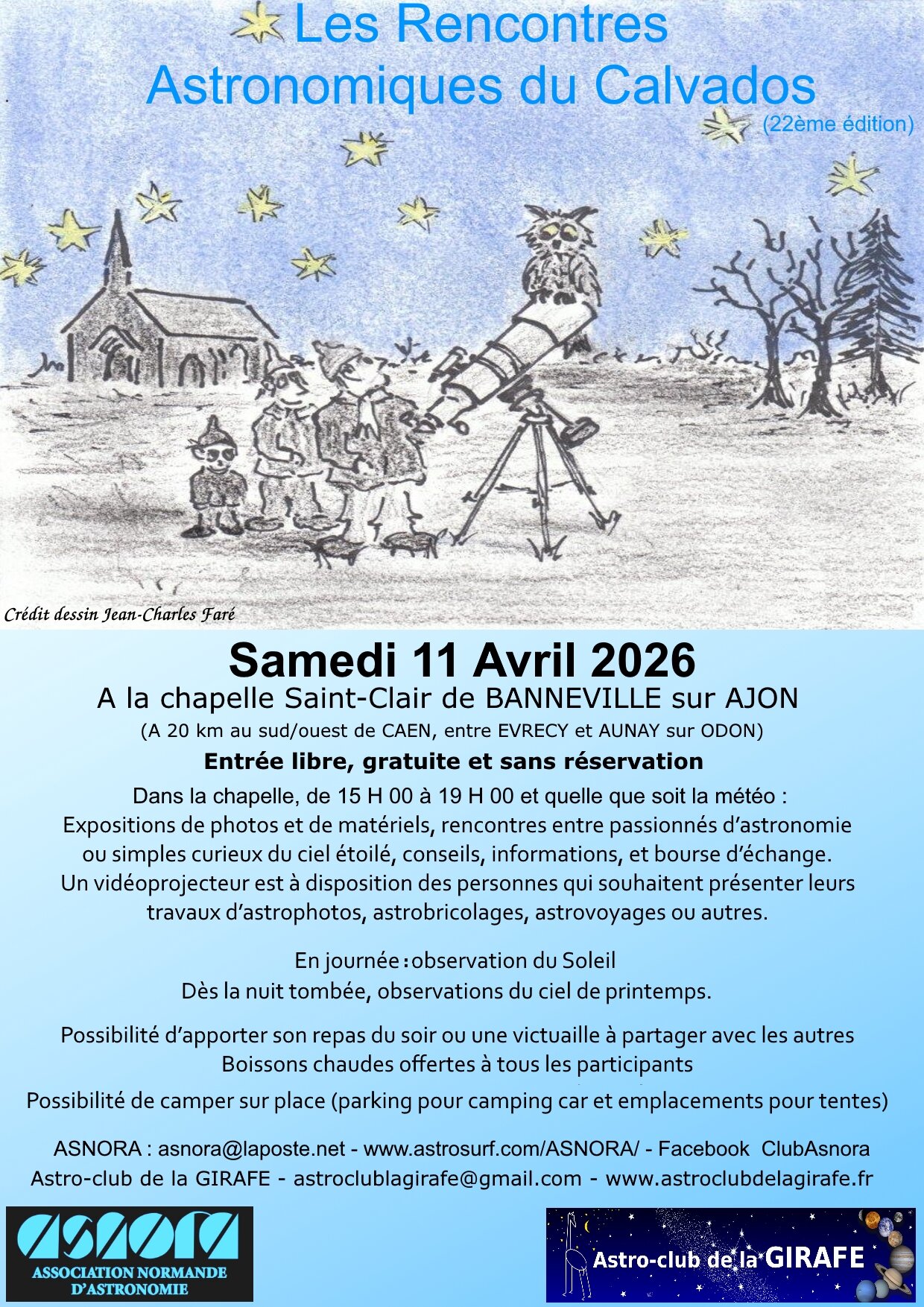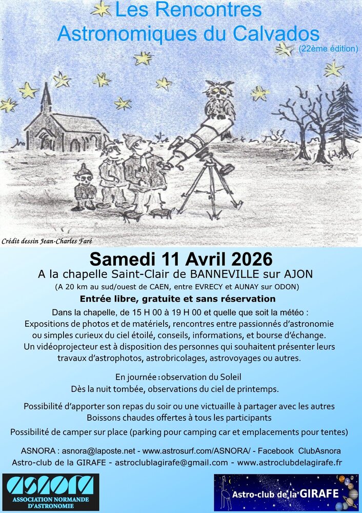 Bonjour, Les traditionnelles Rencontres Astronomiques du Calvados se dérouleront le samedi 11 Avril 2026 à Banneville-sur-Ajon à la chapelle Saint Clair à partir de 15 heures. Au programme : bourse d’échanges, exposition de réalisations d’amateurs, travaux d’astrophotos, un vidéoprojecteur sera à disposition des personnes qui souhaitent présenter leurs travaux , astrovoyages, conférences, ….. pique nique... Bernard