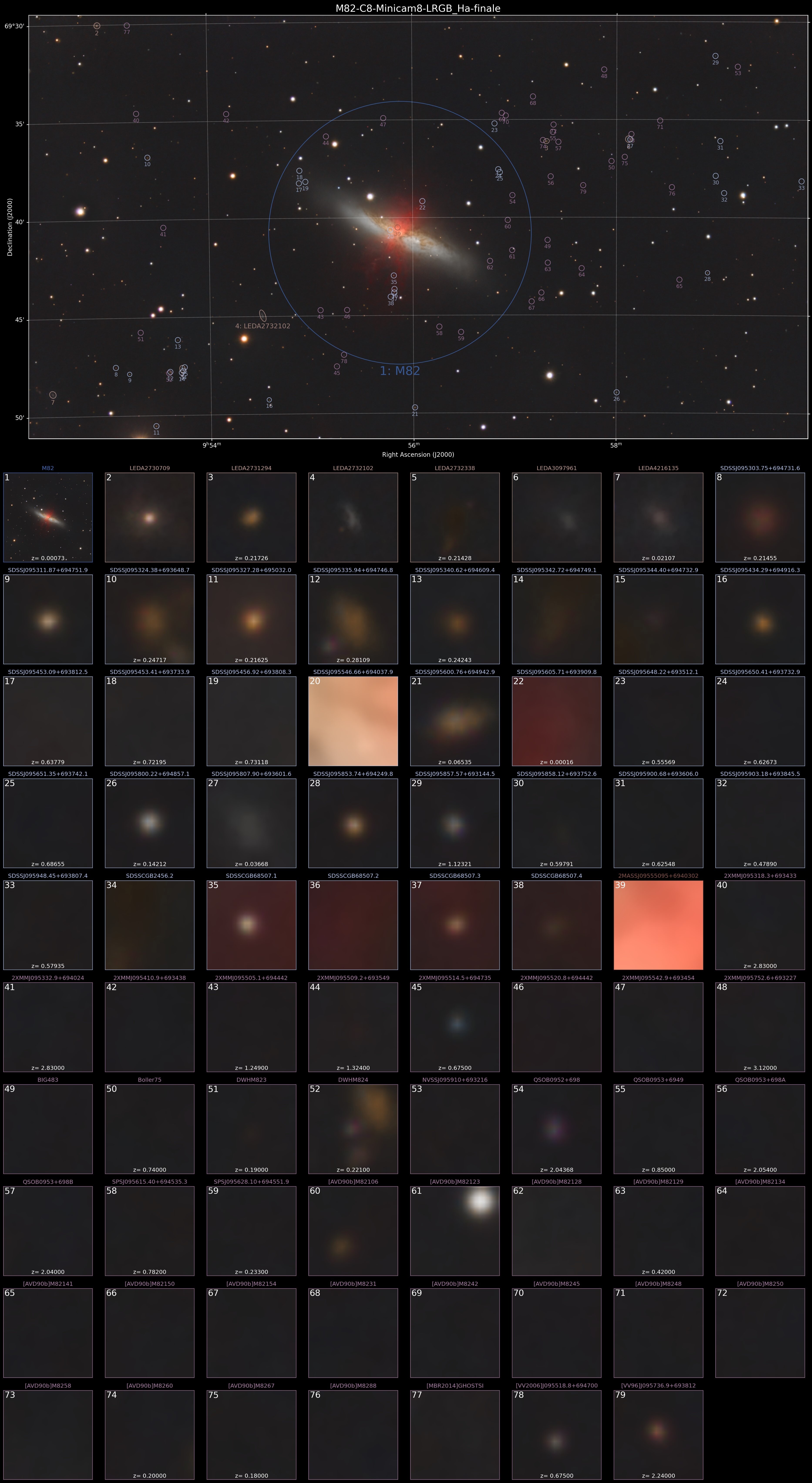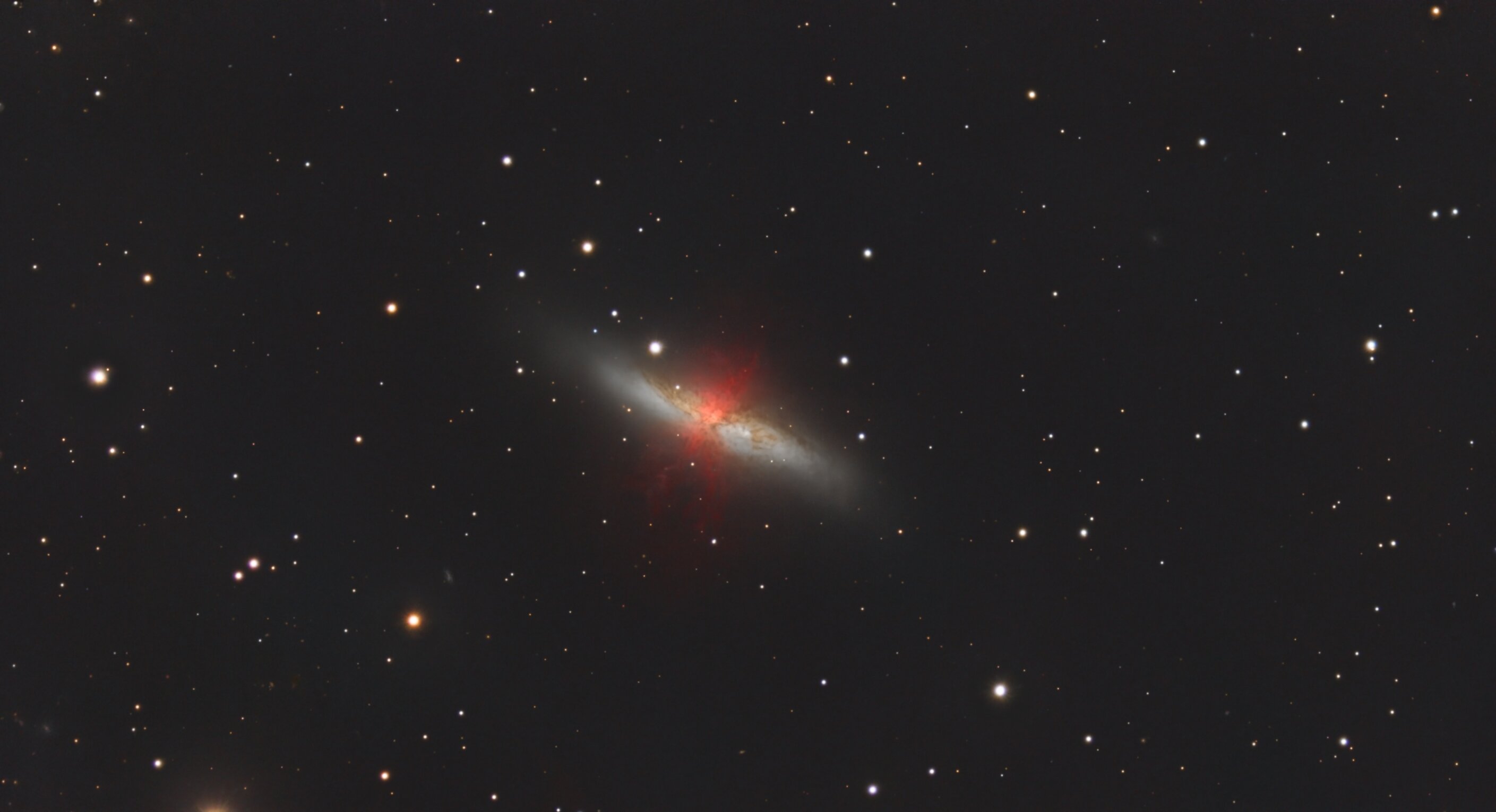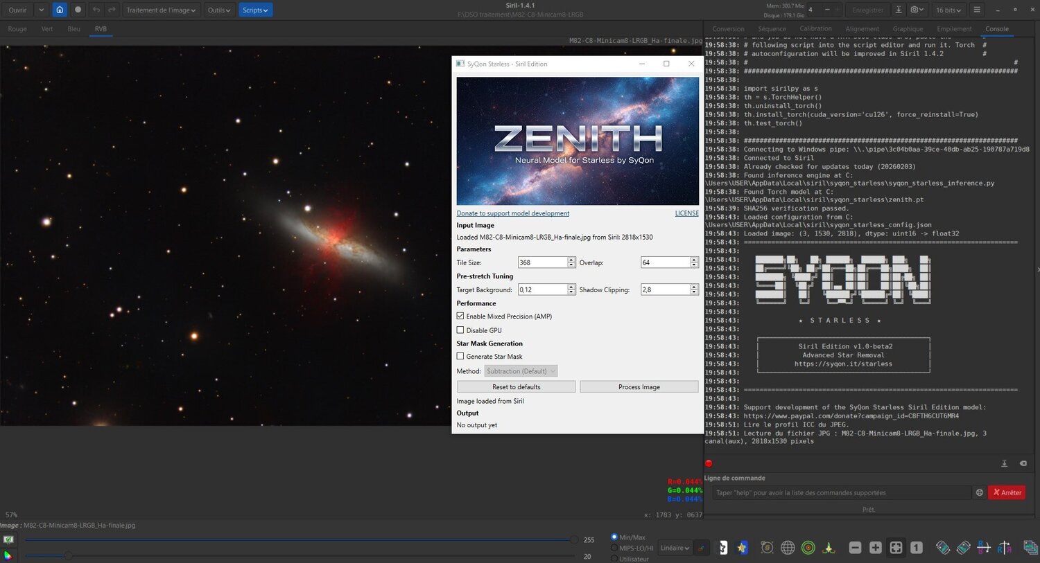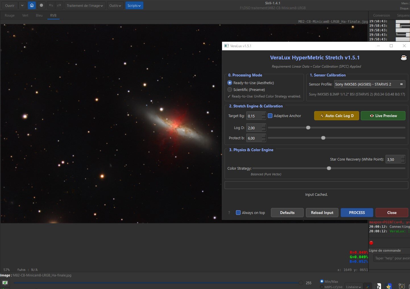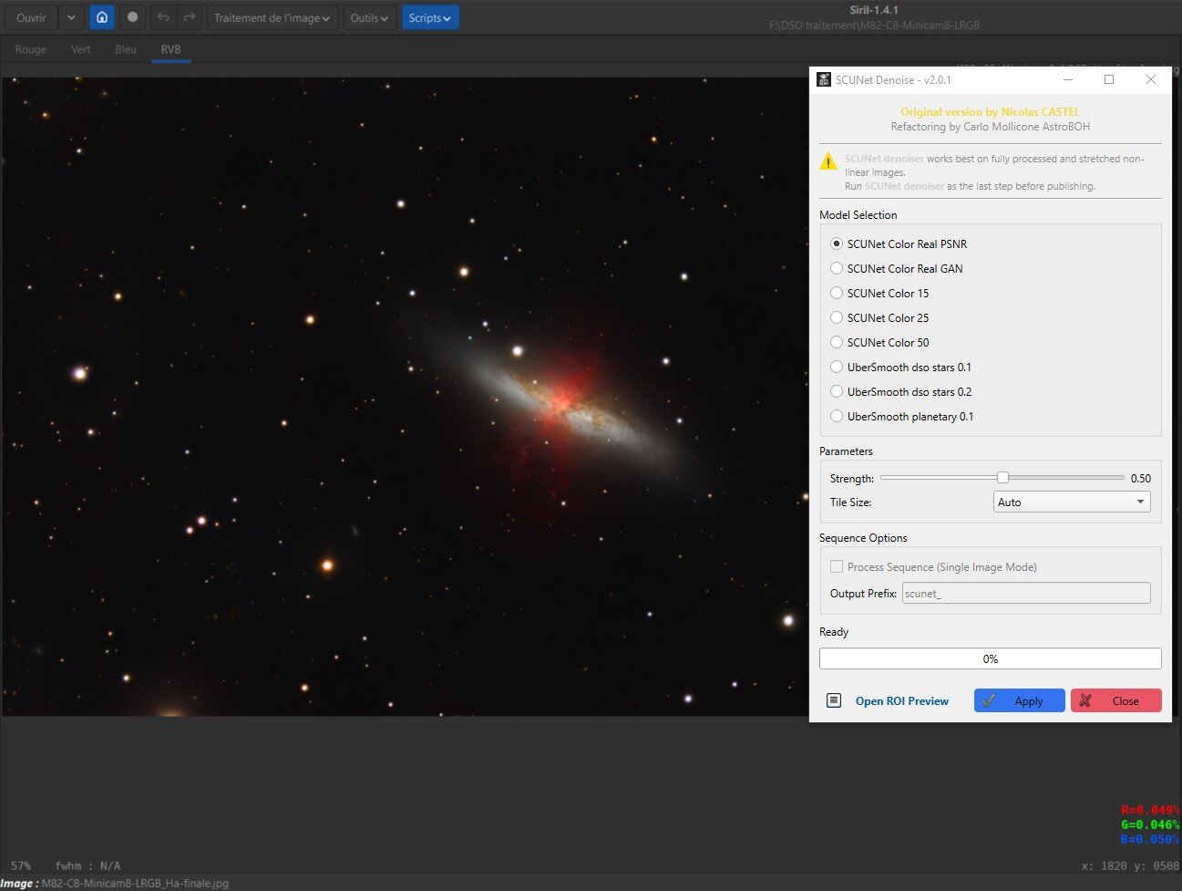 6. Hello, Retour sur ce classique de chez classique, M82 dans la Grande OUrse, toujours un grand plaisir à retourner la voir. SCT Celestron C8 (203/2000) + réducteur Antares 0.63x + réducteur TS CCD47 0.67x focale @ 881mm f/d 4.3 Caméra QHYminicam8 mono Monture HEQ5 kit courroie Rowan Autoguidage via lunette guide 60/270, Asi290mm / PHD2 Acquisition NINA L= 328 x 20s R= 54 x 60s G= 45 x 60s B= 53 x 60s Ha= 24 x 240s Mode Full resolution Gain 82 offset 30 T° -10°C Pré-raitement Sirilic/Siril , Pixinsight. SetiAstroSuite Pro. Une brute de 20s filtre L: J'ai utilisé quelques nouveautés dans Siril: Veralux HMS pour l'étirement: La starless avec Syqon: Le denoise avec SCUnet: