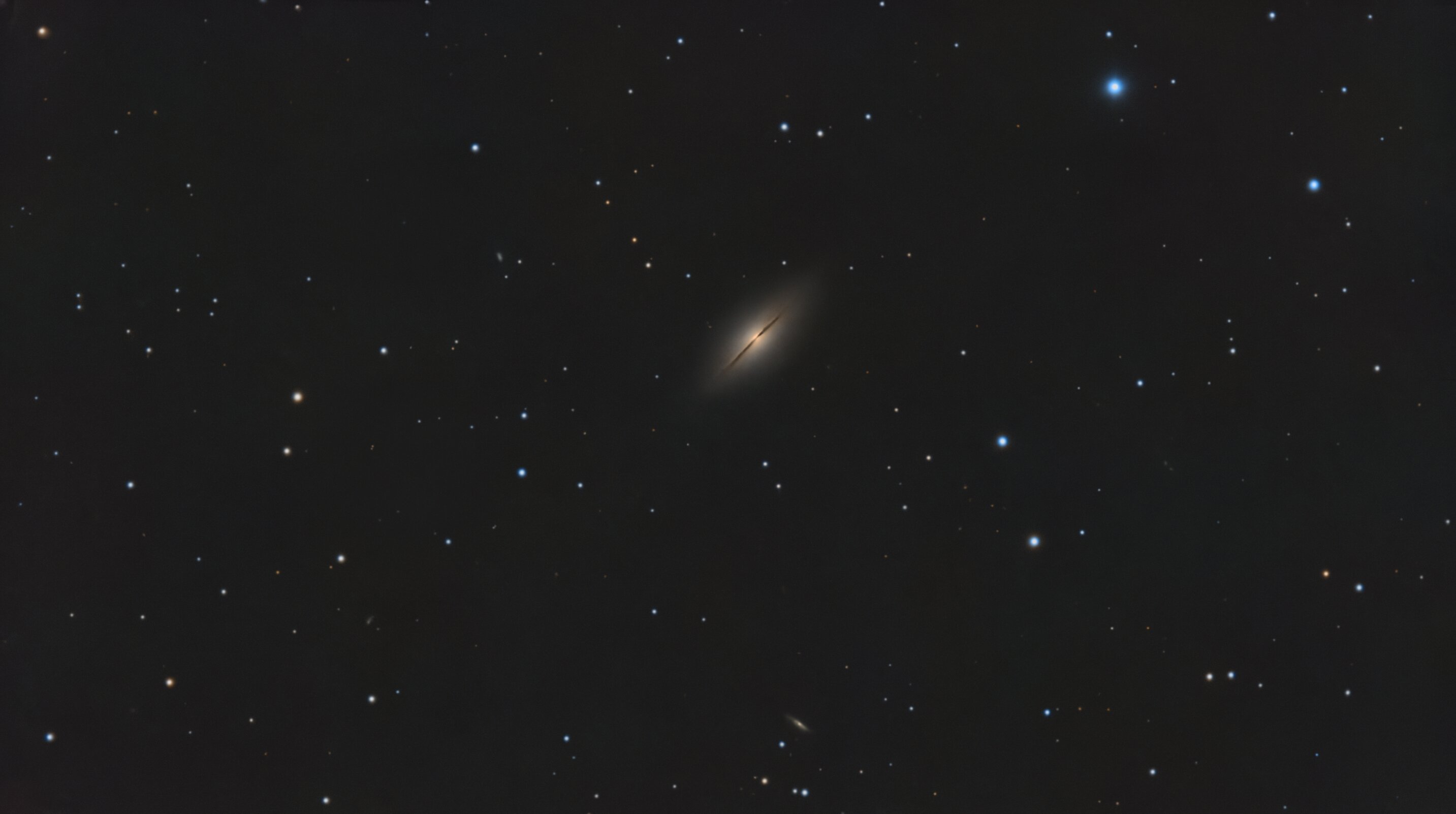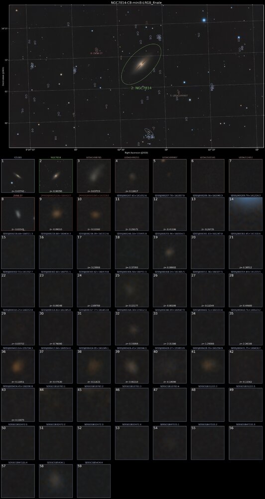 Hello, Encore un traitement laissé en standby. Cette image a été acquise début Octobre 2025...ça commence à dater... NGC 7814 (ou Caldwell 43), aussi surnommée le Petit Sombrero, est une galaxie spirale vue par la tranche et relativement rapprochée, située dans la constellation de Pégase. Sa vitesse par rapport au fond diffus cosmologique est de 694 ± 25 km/s, ce qui correspond à une distance de Hubble de 10,2 ± 0,8 Mpc (∼33,3 millions d'al). NGC 7814 a été découverte par l'astronome germano-britannique William Herschel en 1784. Son surnom de Petit Sombrero provient du fait que son apparence est similaire à celle de la galaxie spirale M104, elle-même dite la galaxie du Sombrero. Étant relativement proche de notre groupe local, NGC 7814 est particulièrement intéressante pour l'étude des amas globulaires. Une étude, avait estimée le nombre d'amas globulaires associés à NGC 7814 entre 500 et 1000, ce qui est étonnamment élevé pour une galaxie spirale, ce taux étant en effet plutôt propre aux galaxies elliptiques. SCT Celestron C8 (203/2000) + réducteur Antares 0.63x + réducteur TS CCD47 0.67x focale @ 881mm f/d 4.3 Caméra QHYminicam8 mono Monture HEQ5 kit courroie Rowan Autoguidage via lunette guide 60/270, Asi290mm / PHD2 Acquisition NINA L= 198 x 150s R= 13 x 45s G= 22 x 45s B= 28 x 45s Mode Full Resolution Gain 82 offset 50 T° -5°C Pré-raitement Sirilic/Siril , Pixinsight. SetiAstroSuite Pro. Une brute de 15s filtre L: A refaire avec plus de focale -