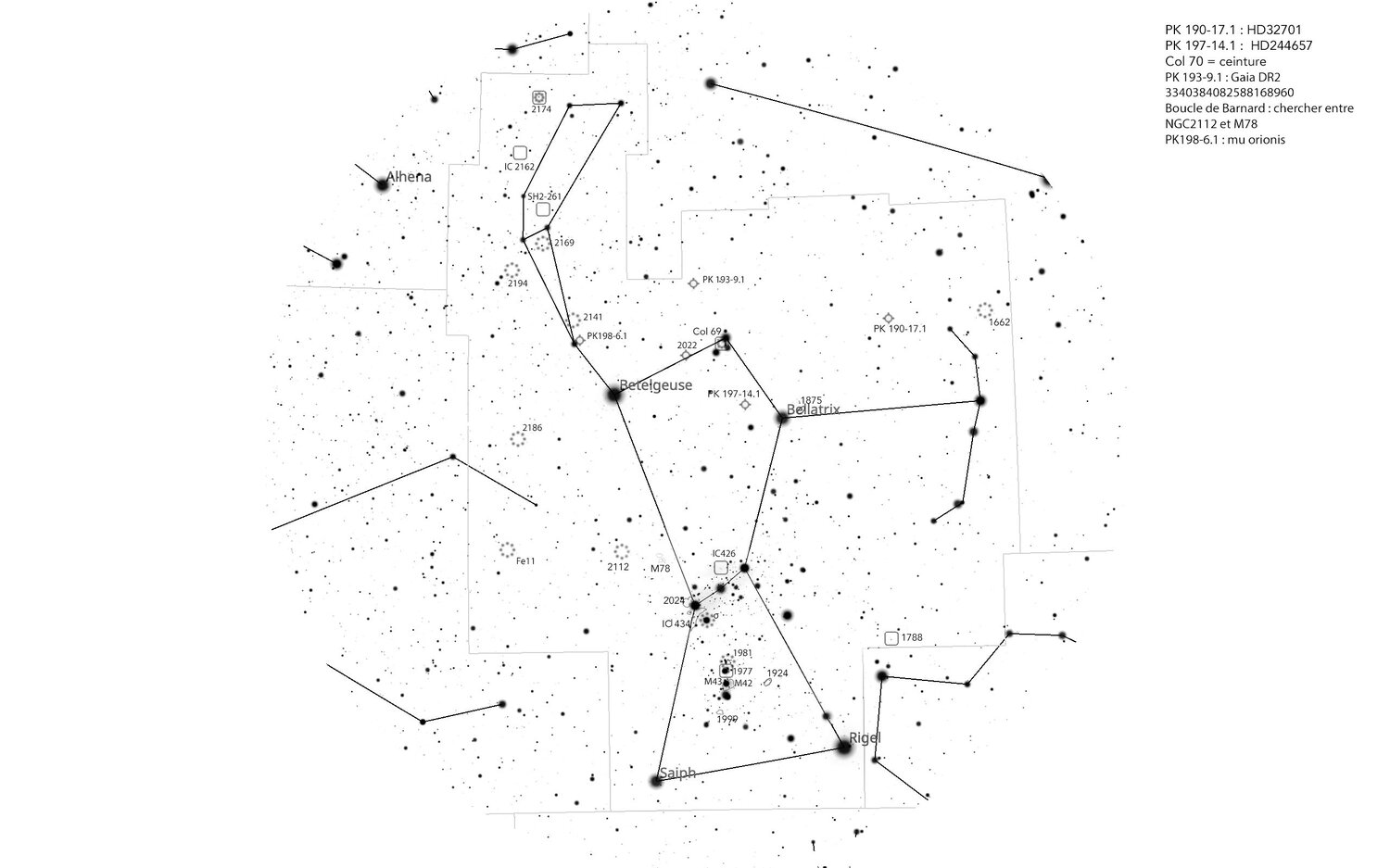 Bonjour à tous mes chers lecteurs avides de CROAs ! J’ai bien cru que le mois de janvier serait un mois vain, mais ces deux soirées du 22 et du 23 ont pu sauver la mise. En réalité j’étais déjà sorti deux fois : une première fois dans la nuit du 8 janvier en plein milieu de la tempête Goretti, où j’avais malgré tout réussi à dénicher aux jumelles quelques amas ouverts dans le Grand Chien, et une deuxième fois lundi dernier, où le ciel semblait pur… mais après quatre ou cinq échecs sur des galaxies dans le Lièvre, j’ai compris qu’un fin voile nuageux faisait perdre quelques points de magnitude à tous les objets du ciel. Même Saiph, le pied gauche d’Orion, n’était visible à l’oeil nu qu’en vision décalée, c’est dire ! J’ai quand même pu récolter entre le Lièvre et Orion quelques amas ouverts assez lumineux, notamment NGC 1662 (qui est un très bel objet) et 2169, troublant tant il évoque en effet le nombre 37. Puis un pauvre M79 en dessous de ses capacités, et la belle ombre d’Europe passant sur Jupiter... soirée en demi-teinte mais pas vaine non plus. Les vraies affaires ont pu reprendre jeudi soir, où cette fois-ci le ciel était parfaitement clair. J’ai saisi ce qui était probablement ma dernière chance d’observer le Lièvre cette année, et retourne m’installer vers 21h dans mon champ voisin habituel. J’explore méthodiquement le lagomorphe céleste, passant au crible chacune des galaxies notées dans les SCP. Les 9 galaxies sont vues, mais je vous passerai les détails, mes notes se résumant à « tache floue vaguement ovale » plus ou moins facile… J’ai souligné toutefois NGC 1964 qui fut plus remarquable que les autres, bien compacte et contrastée. La petite nébuleuse planétaire IC 418 est charmante, un ovale bien lumineux et défini. J’abandonne juste un objet des SCP, une nébuleuse planétaire dont la magnitude me laisse comprendre que seul un ciel de montagne et un miroir de 500mm pourrait me laisser l’apercevoir. Et voilà pour le Lièvre, tous les objets visibles (dans mes conditions) sont vus ! Il était temps, j'avais failli rater le pari de voir tous les objets des SCP en un an ! Passons à la constellation star de l’Hiver. Histoire de me soulager l’oeil après ces petites taches floues, je vais directement sur la grande nébuleuse d’Orion avec l’UHC, et pour une fois, fais l’effort de bien intellectualiser la distinction M42/M43. Je ne vais pas m’attarder sur la description de l’objet, vous la connaissez, non ? Allez, partons à la conquête de l’inconnu. Pas très loin, NGC 1924, galaxie assez difficile, et la nébuleuse NGC 1999. Ici, le filtre est vain, mais je vois bien une forme gazeuse assez large autour d’une étoile, et crois y déceler des irrégularités… A l’ouest d’Orion, NGC 1788 se passe de filtre également, se présente sous la forme d’un beau nuage un qui enveloppe trois étoiles. La NP PK 190-17.1 est facile mais tellement stellaire que seul le blinking avec le filtre UHC m’indique que ce n’est plus une étoile. La galaxie NGC 1875 à côté de Bellatrix aura été la plus difficile de toutes, mais devinée en vision décalée. J’enchaîne ensuite les NP : PK 197-14.1, rond pâle et flou, PK 193-9.1, tout petit disque difficile d’accès, et PK 198-6.1 : celle-ci touche Mu Orionis ! Elle est un peu noyée dans son halo mais le filtre OIII aide à faire la part des choses. Le disque est très visible et bien grand, cette NP aurait été splendide sans sa brillante voisine qui la noie dans sa lumière. Dernière NP avec NGC 2022, qui est bien mise en valeur par le filtre OIII. En grossissant 300x, je vois bien sa forme de tore, une belle « mini M57 » ! Je poursuis sur des objets divers, l’amas de la tête d’Orion, Collinder 69. Très beau groupe d’étoiles, à ne pas trop grossir tant il est grand. Je pense deviner des nébulosités entre les étoiles, mais les halos autour d’elles sont tels qu’il est difficile de faire la part des choses… En retournant vers l’Epée, je passe un peu de temps sur NGC 1977. Si la nébuleuse est clairement là, difficile de bien fixer les chenaux sombres qui la traversent, et je ne parviens pas à voir la forme de ce fameux « homme qui court ». NGC 2024, la nébuleuse de la Flamme, qui m’avait résisté en mars dernier, est bien visible, à condition de sortir Alnitak du champ. Je distingue très bien le long canal noir qui la traverse, et même quelques filaments sombres. Vient ensuite la très fameuse Tête de cheval… Si la longue IC434 est évidente avec l’UHC, ce n’est qu’après de longs efforts que je crois apercevoir par intermittence une petite encoche sombre. Mais rien ne garantit que ce n’est pas mon imagination. Quoi qu’il en soit, je suis bien loin de me représenter une tête de cheval ! Il paraît qu’il faudrait un filtre Hb… dans ma frénésie d’achats de 2025, je n'en ai même pas fait l'acquisition ! Je note le joli petit amas de Sigma dans le même champ, l’image globale reste très belle, tête de cheval ou non. Je passe sur M78 qui me plaît toujours autant, petit fantôme qui nous regarde de ses deux yeux, puis essaie IC426 : je vois bien un nuage qui borde quelques étoiles, mais sans détail. Ici, pas de filtre, c’est une nébuleuse par réflexion, ce qui ne facilite pas sa délimitation. J’enchaîne sur les quelques amas ouverts qui me restaient, Ferrero 11 / Teutsch 164 (je ne prends pas le temps de les distinguer l'un l'autre mais les deux offrent un beau spectacle), le très faible et nébuleux NGC 2141, puis le modeste NGC 2112. Je balaie la région, censée être la zone où la boucle de Barnard est la plus visible. Il est en effet possible que j’aie senti un vague luminosité de fond à certains endroits, mais tout cela n’est ni spectaculaire, ni confirmé. Il me reste 4 nébuleuses pour faire le tour d’Orion. Il me semble bien voir SH2-