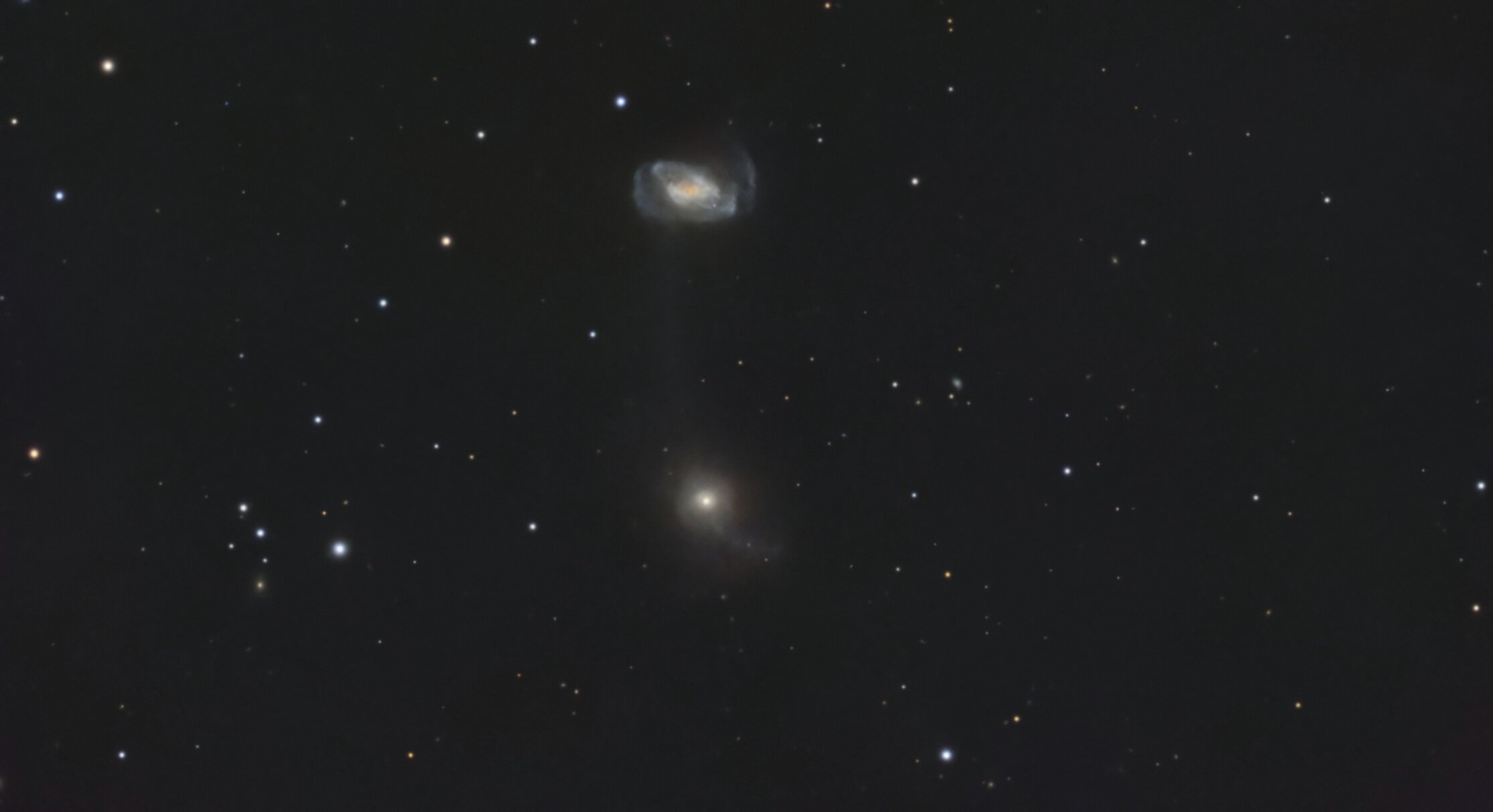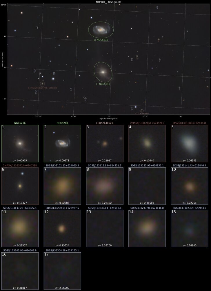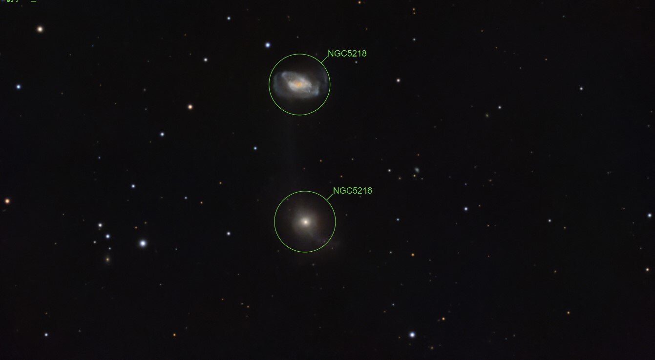 2. Hello, Voici ARP104, 2 galaxies en intéraction. Déjà faite par le passé, je voulais me rapprocher un peu de ce duo. Arp 104 , également connu sous le nom de système de Keenan , est l'entrée 104 du catalogue Atlas des galaxies particulières de Halton Arp pour la galaxie spirale NGC 5216 et la galaxie globulaire NGC 5218. Les deux galaxies sont reliées par un pont de matière galactique s'étendant sur 22 000 années-lumière. En 1790, William Herschel découvrit les galaxies, et en 1926, elles furent étudiées par Edwin Hubble . En 1935, Philip C. Keenan publia le premier article sur le pont reliant les galaxies, qui fut redécouvert en 1958 aux observatoires de Lick et de Palomar . SCT Celestron C8 (203/2000) focale @ 1897mm f/d 9.3 Caméra QHYminicam8 mono Monture HEQ5 kit courroie Rowan Autoguidage via lunette guide 60/270, Asi290mm / PHD2 Acquisition NINA L= 158 x 45s R= 97x 60s G= 98 x 60s B= 99 x 60s Mode Full Resoution Gain 82 offset 30 T° -10°C Pré-raitement Sirilic/Siril , Pixinsight. SetiAstroSuite Pro. Une brute de 45s avec le filtre L: