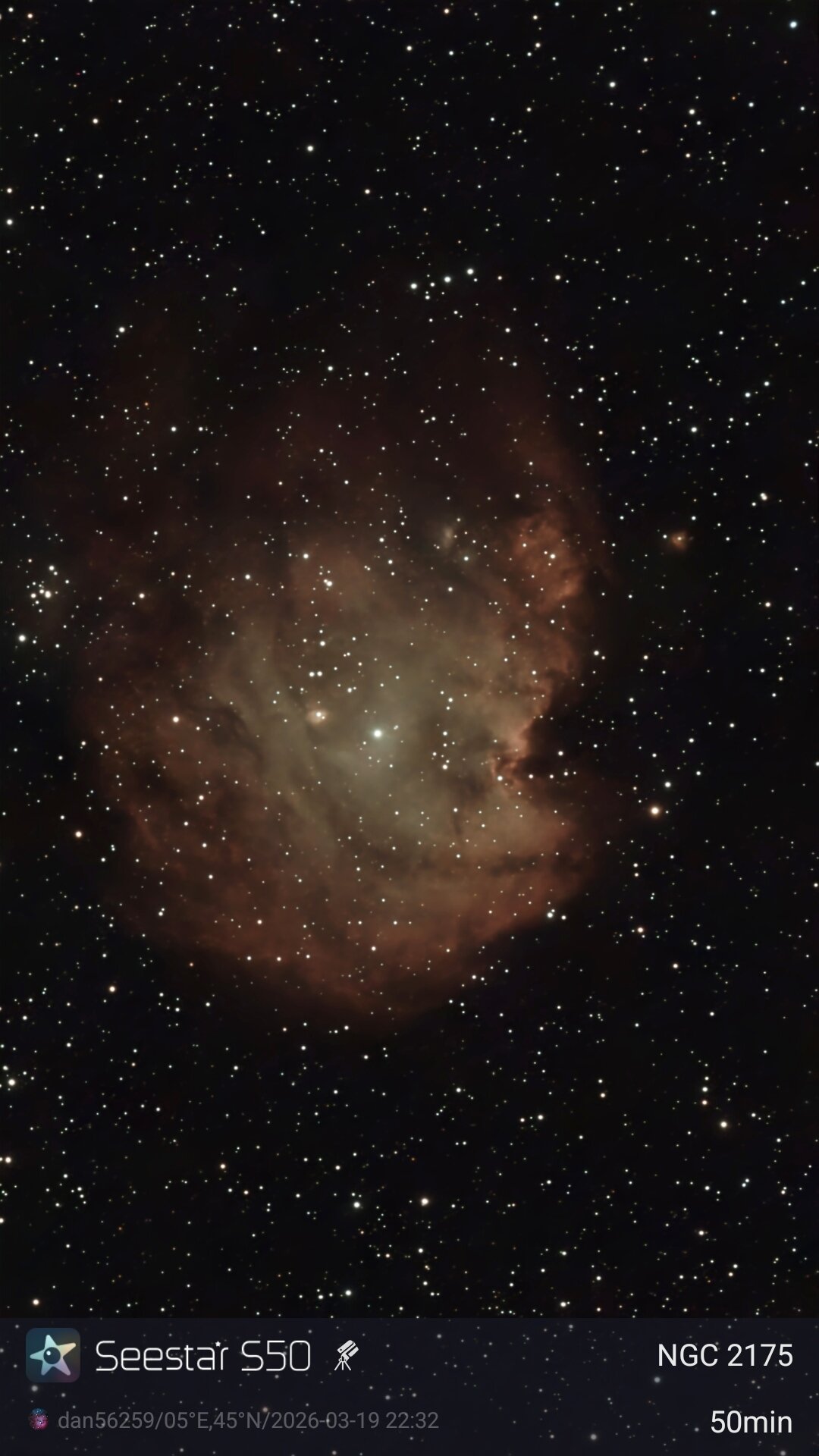NGC 2175 20260319 Bonjour Un test ce jour en EQ 20 s avec la version V 3.10 / 7.06 du S 50 NGC 2175 20260319 49 min 149 x 20 s prise 149 rejet 75 S 50 EQ LP BACKYARD France ISERE Bortle class 4 Traitement S 50 uniquement denoise lum contraste sat Malheureusement j’ai encore du rejet avec la nouvelle version malgré un pied stable et pas de vent La mise en station n’était pas parfaite En vous souhaitant un bon ciel Daniel