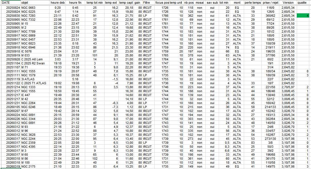 T'es sûr que ça vient de la dernière maj? (je ne l'ai pas installée). Bonjour Le taux de rejets a plutôt augmenté avec les mises à jour récente La dernière mise a jour semble avoir corrigé un peu le pb Mais difficile de faire la part des choses Vent / vibration / erreur périodique / équilibrage / algorithme suivit az / correction backslash / dithering Voici un tableau de mes prises La perte de temps est le rapport en pourcent entre le temps total de la session - temps retenus pour l'empilement divisé par le temps total Daniel