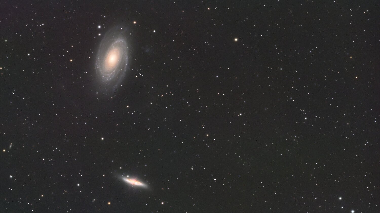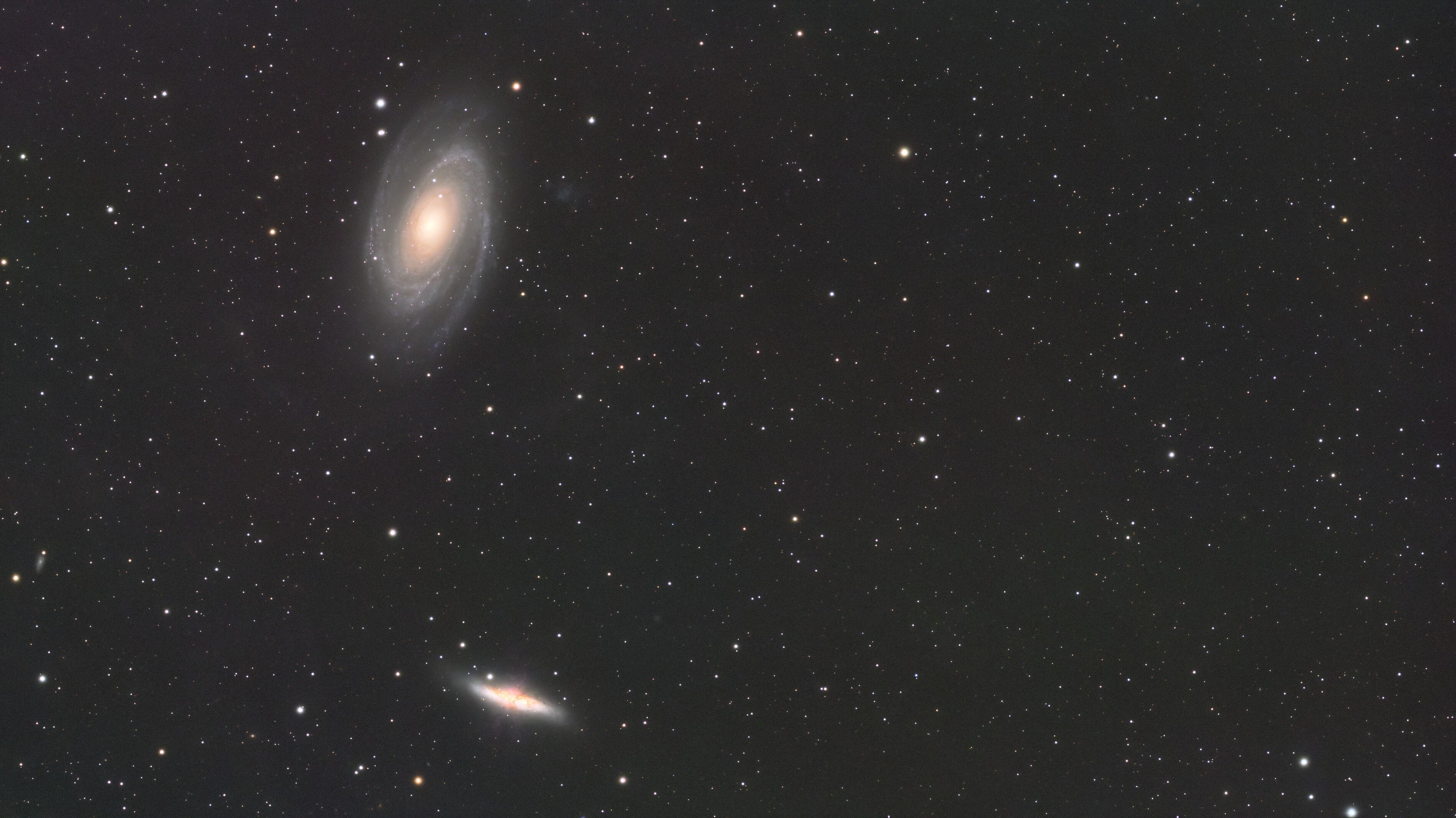J'avais essayé de faire M81 et M82 en faisant ressortir les IFN, ce n'était pas un vrai succès, j'ai essayé de le faire "normal" et ce n'est toujours pas top. Je n'arrive pas à obtenir un bon résultat (c'est sans doute pour ça que je n'aime pas les galaxies ) , après je pense que la pollution du ciel bordelais n'aide pas