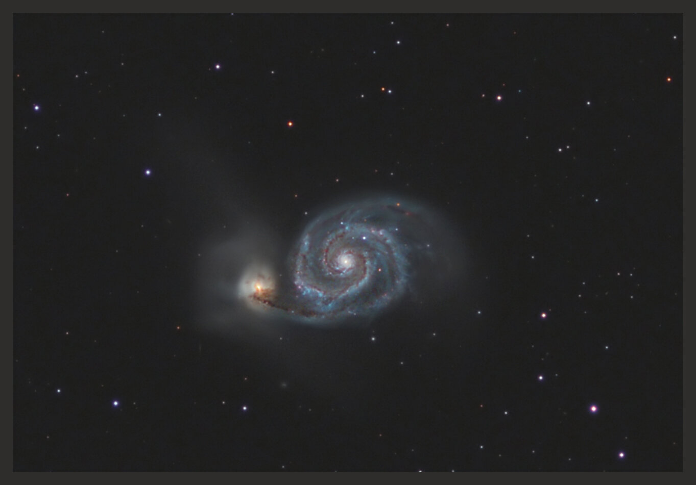Hello les Zamis !! 🙂 Après quasi 1 an 1/2 d'utilisation trés agréable de mon Canon 6D défiltré, j'ai re-franchi le pas de l'astrophoto avec une caméra, ici une ZWO 2600MC Duo. Voici ma première image avec ce setup, toujours nomade (même si en fait je reste sur ma terrasse ) Alors le setup : Askar FRA400 F/D 5.6 (400 mm de focale, 72 mm d'ouverture) Monture Skywatcher GTI ASIAIR PLUS Caméra ZWO 2600 MC Duo (capteur 23.5 x 15.7 mm, pixels de 3.76 um) Un filtre SVBony SV260, broadband ( 5 bandes) plutôt essentiel pour les galaxies de mon ciel urbain La prise de vue : Localisation : Bordeaux (Bortle 7) 13h de pose (sub de 5 min autoguidé) sur 3 nuits Un peu de lune dans la quasi totalité des poses En synthèse de cette 1ere lumière de ce setup avec la 2600 MC Duo : - Autoguidage trés efficace et rapidement opérationnel sur la petite skywatcher GTI (pas de déchet) - la qualité du ciel urbain reste une limite, malgré les 13h de pose et une caméra sensiblement plus performante que le canon 6D défiltré - la différence flagrante entre la définition obtenu avec cette caméra et la canon 6D, qui permet, même à petite focale, d'imager des galaxies de bonne dimension avec un peu de détail (sympa pour le printemps) Donc, ci-dessous 3 images : une à 50%,faite avec la 2600 MC un crop à 130% faite avec la 2600 MC la même faite avec le canon 6D, on voit bien la différence de piqué sur l'image. -