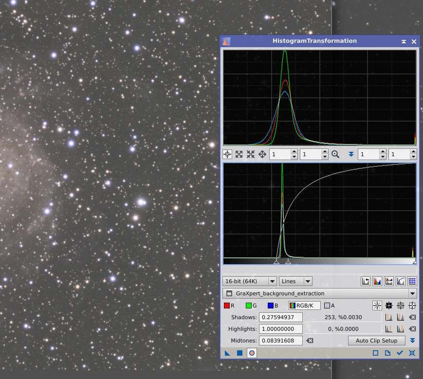 Bonjour, La disette continuant chez moi, je tente de reprendre plusieurs sessions sur IC342 faites avec mon ancienne lunette sur lesquelles j'ai un peu plus de 18h en IRCut. J'avais sorti une image plutôt propre en 2024 mais sombre (que j'ai perdu entre temps d'ou cette reprise, je n'ai plus qu'une impression photo) 2 sessions, même setup les 23 et 25 octobre 2024 : Orion 80ED, Filtre IRCut SVBony en 2'', Uranus-C Pro. 96x300s conservés pour le 24/10 et 120x300s conservés pour le 25/10. Aucune idée des conditions meteo ces deux jours... En substance j'arrive a traiter les 2 sessions séparément, mais si je stack les 2 ensemble ça me sort des halos jaunes monstrueux sur le starless . Le phénomène existe aussi avec les 2 sessions séparées mais ça reste limité et gérable, je met un traitement rapide a la fin pour donner un ordre d'idée. J'ai tenté plusieurs méthodes de retrait de gradient, d’etirement mais j'ai toujours ces halos jaunâtres après starnet, et je n'arrive pas a les limiter sans enlever drastiquement du signal (ca bouffe littéralement le signal des bras s'il y en a...) Au debut je shootais a 300s , je ne sais pas si c'est la raison. Je suis vite descendu à 180s en 2025. Je mets le stack starless avec saturation très exagérée pour mettre en lumière ces halos pas beau du tout. BlurX amplifie le problème mais ne me semble pas être la cause. D'autre part (et c'est peut être la cause du problème?) j'ai un pic bleu dans mon histo dès que j’étire (gradiant -> solve -> SPCC -> BlurX -> starnet -> histo) mais que je n'ai pas si j’étire avant starnet -gradiant -> solve -> SPCC -> BlurX -> starnet -> histo) Des suggestions magiques? (Une fois résolu j'ai aussi 5h de HaOIII a ajouter, prises sur la même cible 6 mois plus tard) Merci et bon ciel a tous! Philippe BlurX avant Starnet en lineaire puis histo BluX en lineaire sans starnet puis histo Starless (exagéré) des 2 sessions stackées, 202x300s Starless du 23/04/24 seul, on voit tout de meme le signal bouffé mais ca ne rend pas de halo jaune
