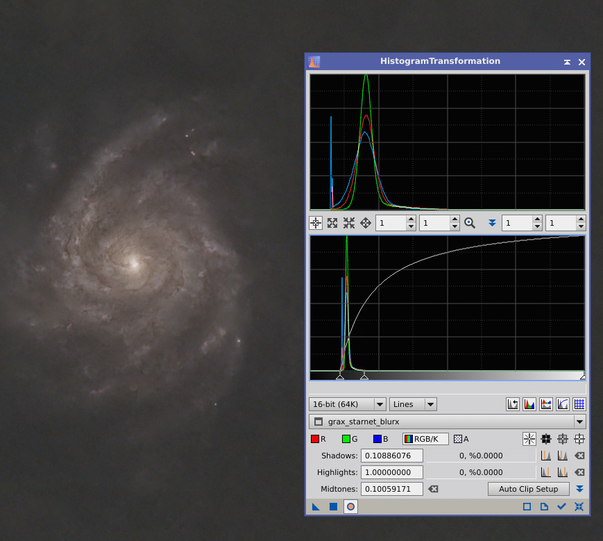 Je comprends et c'est une bonne raison. Il faut composer avec les limites de son matériel ! Je ne dirais pas ça comme ça. Comme je ne passe pas par du Starless, l'objectif lors de l'ajout de la luminance est de modifier le moins possible les étoiles visibles dans l'image RGB tout en ajoutant la profondeur (ici par exemple plus d'étoiles et de petite galaxies dans le fond de ciel) apportée par la luminance. Pour cela, j'essaye en général d'harmoniser la taille des étoiles de la luminance et de l'image rgb pour qu'elles soient "compatibles". Ici, par exemple, j'ai utilisé Blurx sur la luminance avec un coeff de "Sharpen Stars" bien plus fort que sur l'image RGB. Voilà ce que ça donne ici quand j'utilise LRGBCombination: les étoiles existantes sont peu modifiées, mais on voit bien les petites étoiles et les galaxies apparaître (sans parler des changements sur M51).