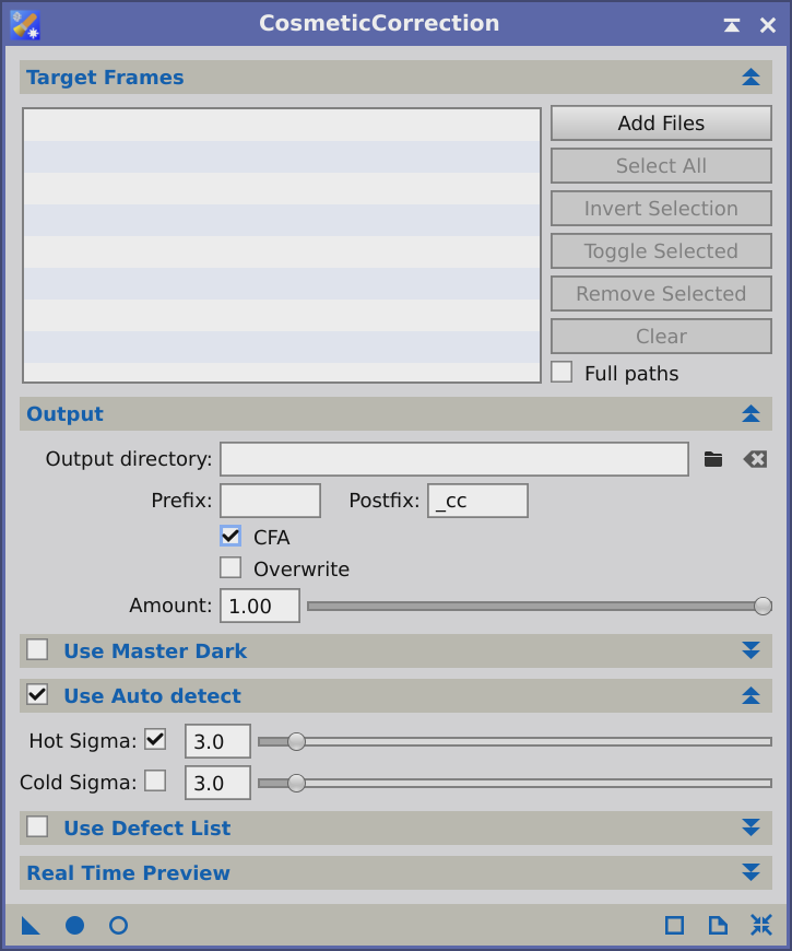 Alors dans Pix il faut ouvrir le process CosmeticCorrection et le configurer comme cela: A noter que la valeur de 3 pour le Hot Sigma convient si tes images sont correctement échantillonées. Si tu es sous échantillonée il faut sans doute augmenter cette valeur. Ensuite tu crées une instance de ce process (avec le bouton trianglulaire en bas à gauche) et tu l'appelles (par exemple) CC Ensuite dans WBPP du décoches Automatic dans la section "Cosmetic Correction" et tu choisis ton template CC Ce que cette manip va permettre c'est d'utiliser le mode "Auto detect" du process CosmeticCorrection pour identifier les pixels chauds restants après la calibration et les remplacer par une moyenne des pixels voisins (en fait les pixels n+2 pour les images couleurs). C'est une opération peu rigoureuse mais relativement efficace quand on a pas un masterdark sufisament récent.