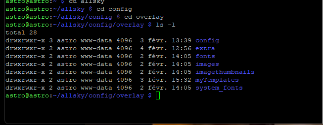 24. Vider le cache du navigateur Sinon : Vérifie que tu as les droits en écriture avec : se sonnecter en SSH, aller dans le dossier allsky/config et taper : ls -l Tu dois voir quelque chose comme ceci : rw (read-write)