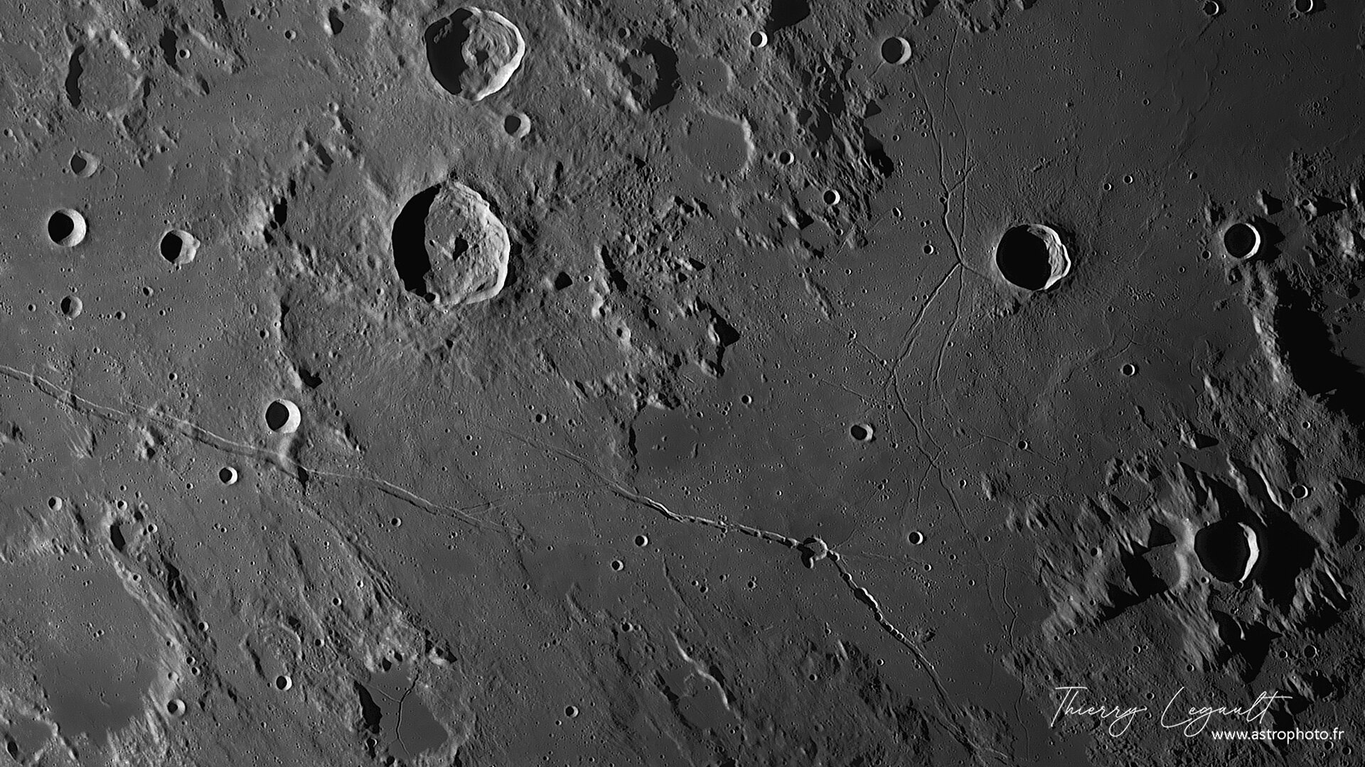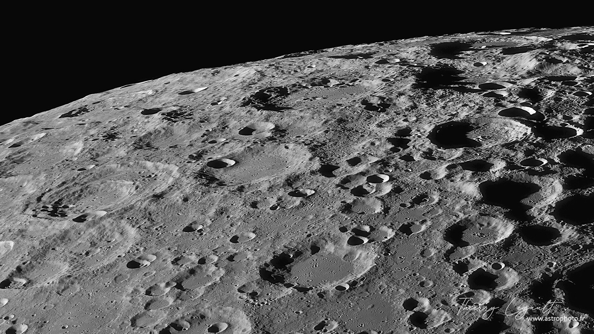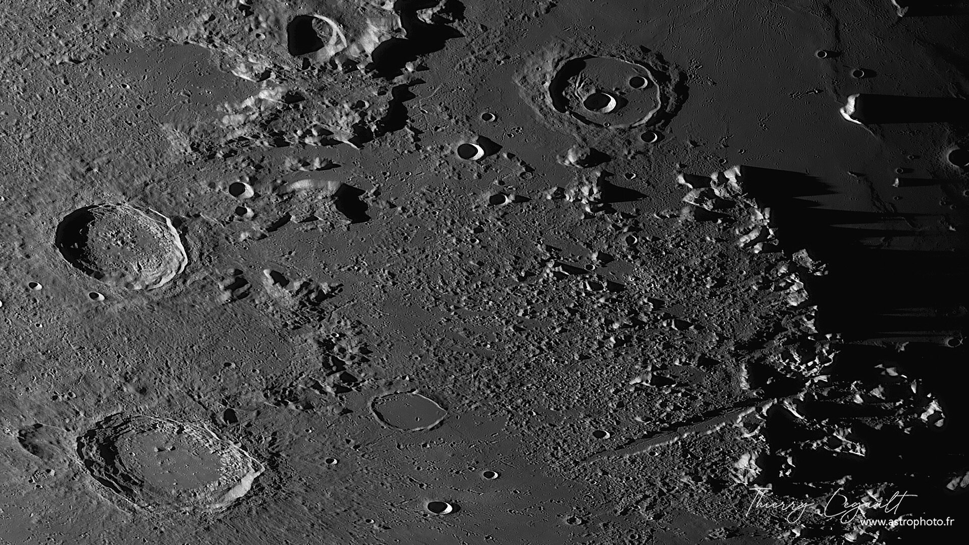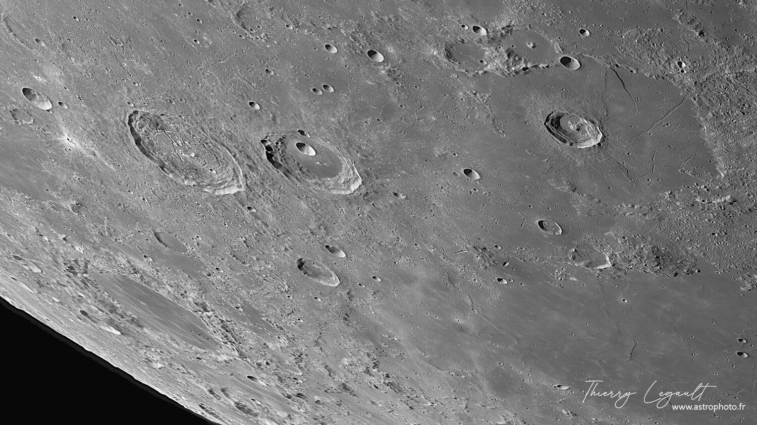 2. Enfin de bonnes conditions (moins d'une heure, mais ça a suffi pour boucler l'ensemble des tuiles nécessaires) le 24 février, pour réaliser l'équivalent de mes derniers quartiers de 2016. Toujours le même équipement : C14 Edge HD et ASI1600MM, filtre vert (pas d'ADC). La mosaïque full (8300x14300 pixels) ici : http://www.astrophoto.fr/l20260224c.jpg Quelques crops pour vous inviter à vous balader dans l'image complète (y compris loin du terminateur !) Le pôle sud Aristote, Eudoxe, les Alpes et leurs immenses ombres au soleil levant Triesnecker, Hyginus Atlas and co