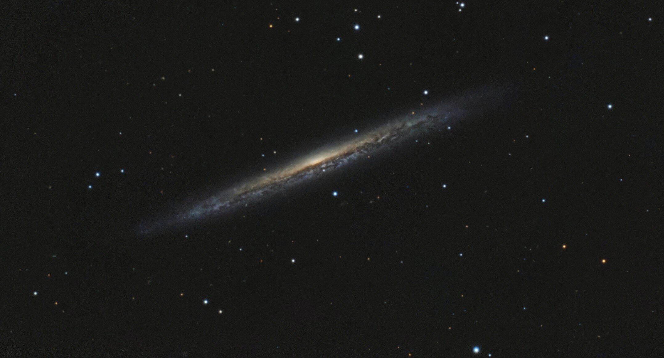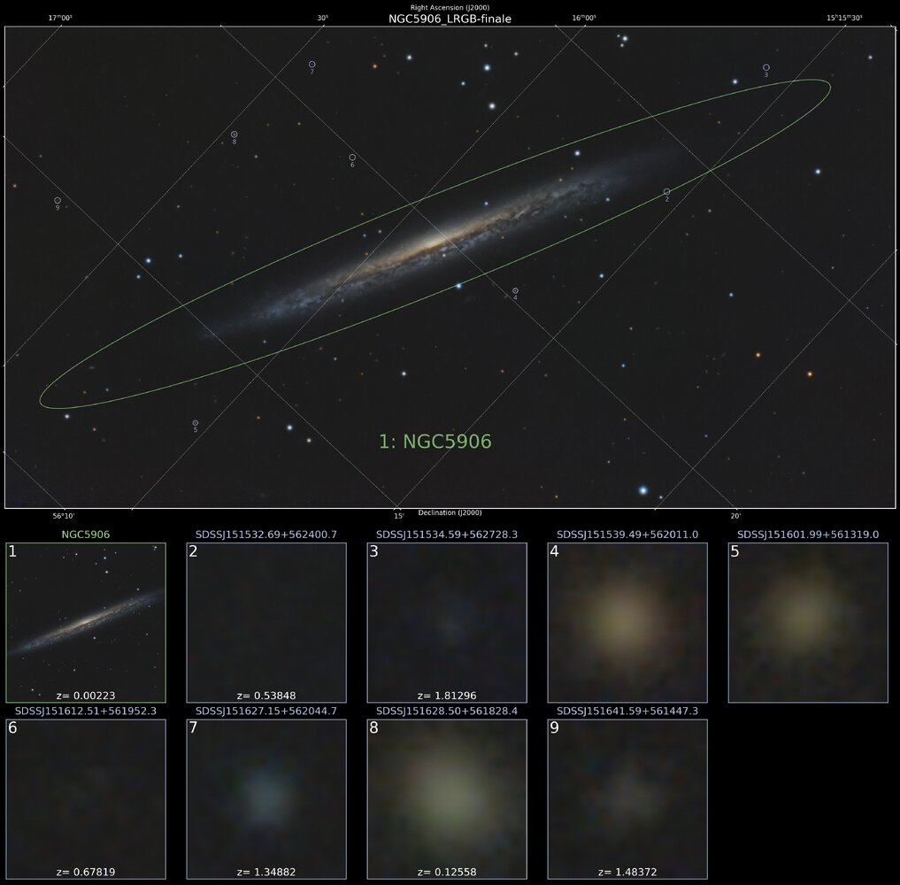 Hello, Encore un classique que j'ai toujours grand plaisir à refaire quasi chaque année, en essayant d'améliorer les choses au passage. NGC 5907 aussi appelé la galaxie de la Lame de couteau est une vaste galaxie spirale vue par la tranche et située dans la constellation du Dragon. Sa vitesse par rapport au fond diffus cosmologique est de 727 ± 4 km/s, ce qui correspond à une distance de Hubble de 10,72 ± 0,75 Mpc (∼35 millions d'al). NGC 5907 a été découverte par l'astronome germano-britannique William Herschel en 1788. NGC 5906 est la partie de NGC 5907 située à l'ouest de sa ligne de poussière. Cette partie de la galaxie a été enregistrée par le physicien irlandais George Stoney le 13 avril 1850. On a découvert en 2008 qu'un flux stellaire fait deux fois le tour de NGC 5907. En fait, les données captées par l'instrument Dragonfly Telephoto Array ne montre pas deux rubans, mais un seul d'une longueur totale d'environ 220 kpc (∼718 000 al). On a aussi découvert plusieurs amas globulaires dans ce flux stellaire ainsi qu'une population significative de nouvelles étoiles. SCT Celestron C8 (203/2000) focale @ 1897mm f/d 9.3 Caméra QHYminicam8 mono Monture HEQ5 kit courroie Rowan Autoguidage via lunette guide 60/270, Asi290mm / PHD2 Acquisition NINA L= 399 x 30s R= 72 x 60s G= 75 x 60s B= 59 x 60s Mode Full Resoution Gain 82 offset 30 T° -10°C Pré-raitement Sirilic/Siril , Pixinsight. SetiAstroSuite Pro. Une brute de 30s avec le filtre L: