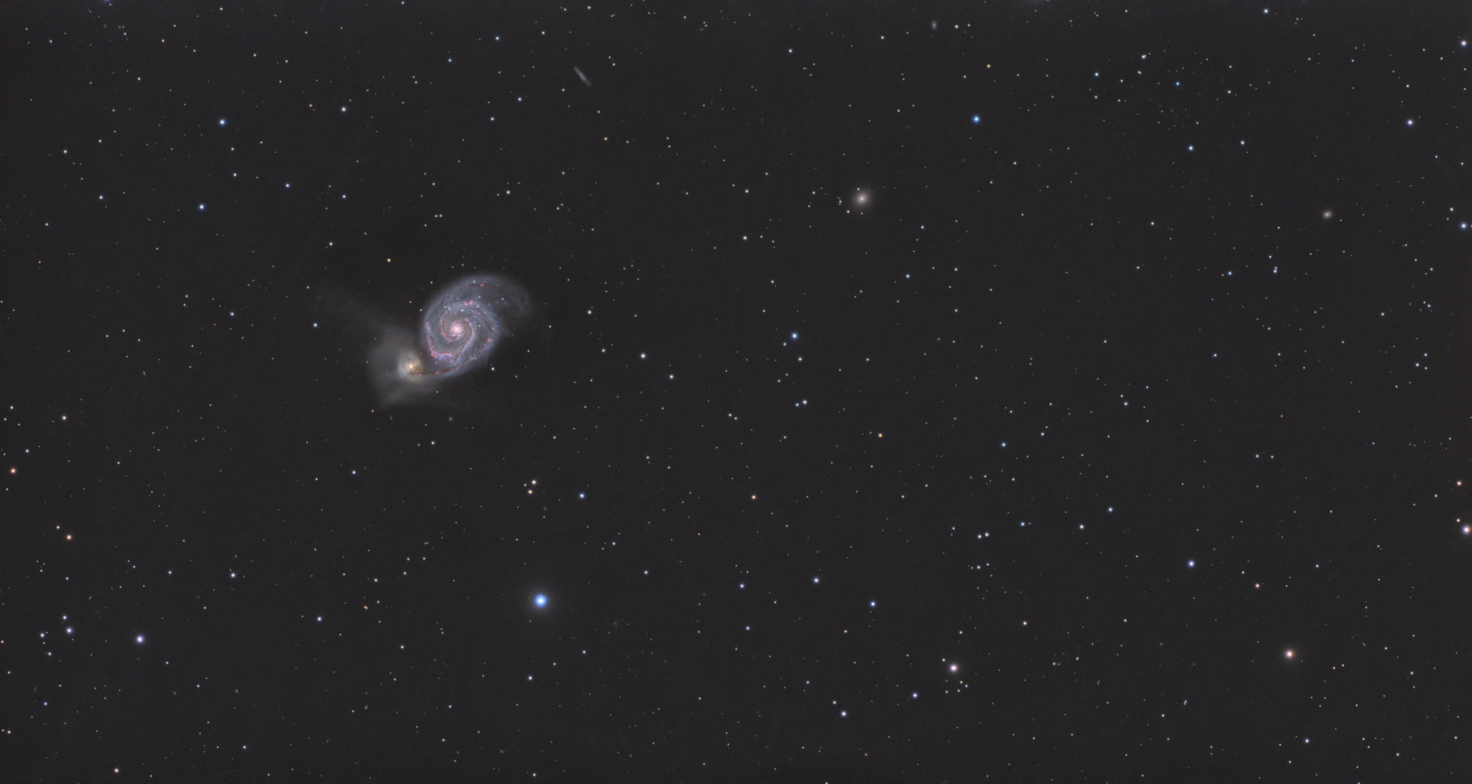Hello, Voici ARP104, 2 galaxies en intéraction. Déjà faite par le passé, je voulais me rapprocher un peu de ce duo. Arp 104 , également connu sous le nom de système de Keenan , est l'entrée 104 du catalogue Atlas des galaxies particulières de Halton Arp pour la galaxie spirale NGC 5216 et la galaxie globulaire NGC 5218. Les deux galaxies sont reliées par un pont de matière galactique s'étendant sur 22 000 années-lumière. En 1790, William Herschel découvrit les galaxies, et en 1926, elles furent étudiées par Edwin Hubble . En 1935, Philip C. Keenan publia le premier article sur le pont reliant les galaxies, qui fut redécouvert en 1958 aux observatoires de Lick et de Palomar . SCT Celestron C8 (203/2000) focale @ 1897mm f/d 9.3 Caméra QHYminicam8 mono Monture HEQ5 kit courroie Rowan Autoguidage via lunette guide 60/270, Asi290mm / PHD2 Acquisition NINA L= 158 x 45s R= 97x 60s G= 98 x 60s B= 99 x 60s Mode Full Resoution Gain 82 offset 30 T° -10°C Pré-raitement Sirilic/Siril , Pixinsight. SetiAstroSuite Pro. Une brute de 45s avec le filtre L: