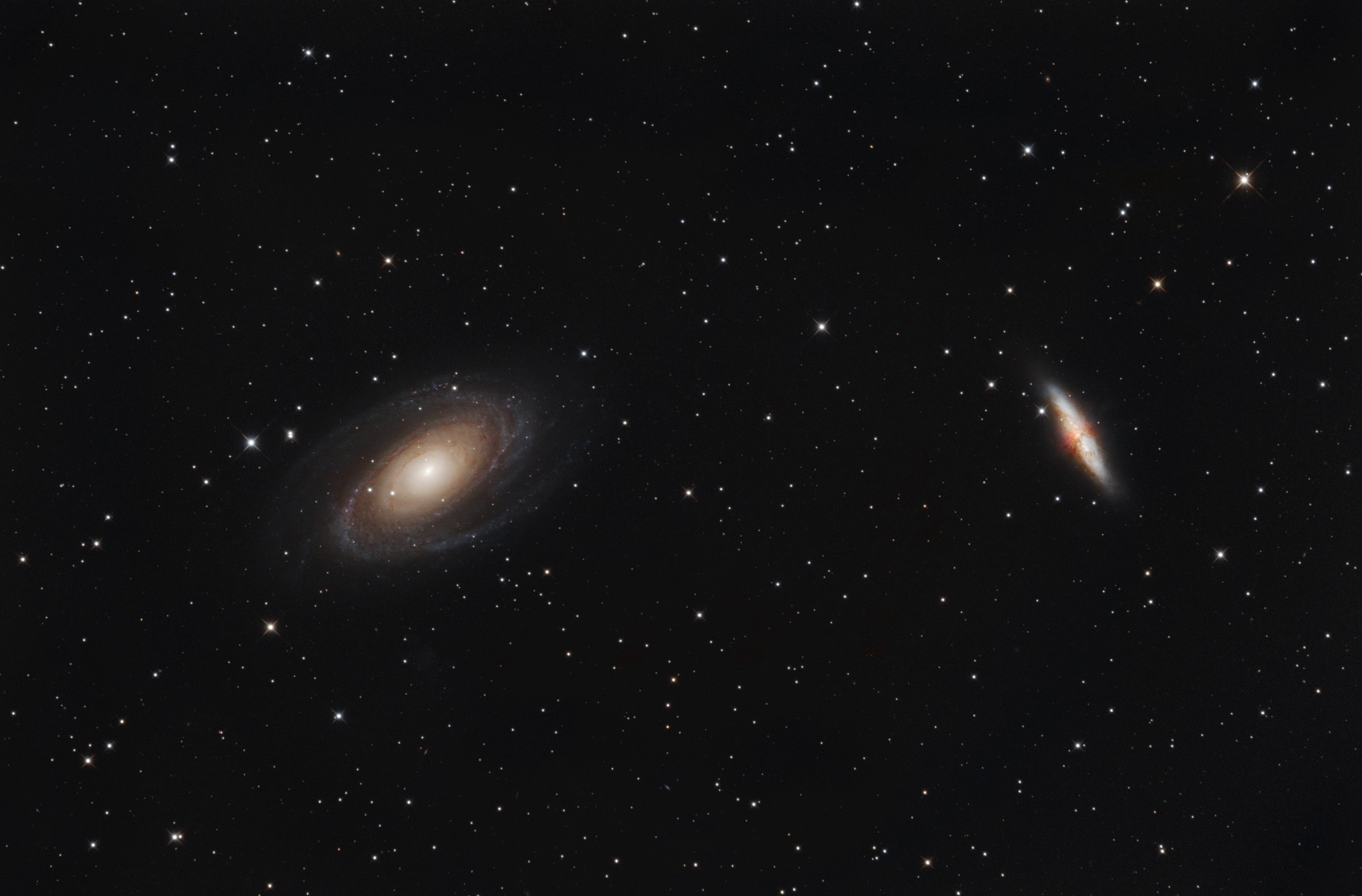 L'image n'est pas facile, c'est clair ! J'ai utilisé MGC avec un réglage assez agressif du "gradient scale"pour tenter de corriger les gradients. C'est, selon moi, le seul outil qui est capable de corriger des gradients aussi difficiles sans trop altérer la réalité des choses. Graxpert par exemple, peut sembler donner de bons résultats, mais qui s'avèrent souvent décorrélés de la réalité quand on les compare avec des images de référence. -