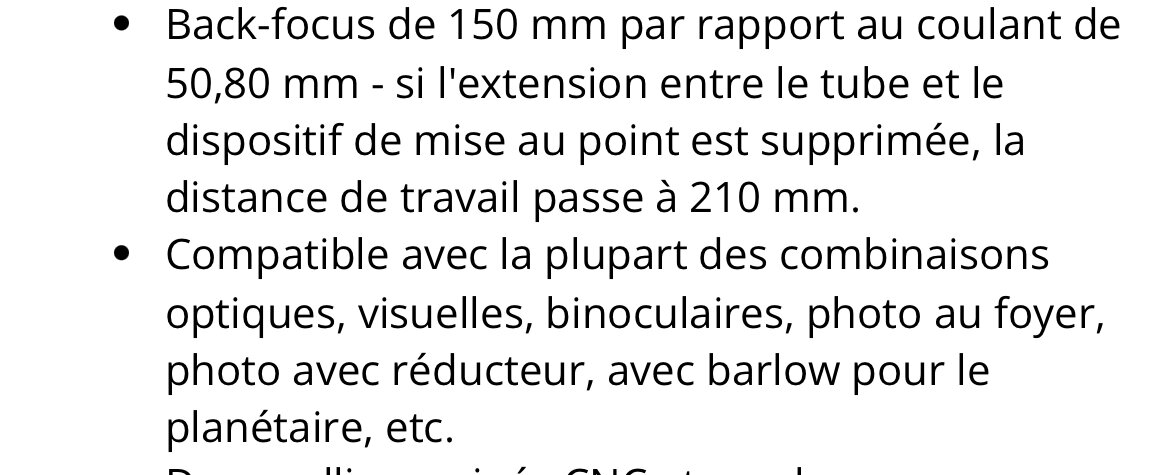 16. Il me semble que sur cette lunette il y a une rallonge intégrée qui, si on la retire, permet d’avoir un backfocus énorme, suffisant pour une bino. Pour du planétaire, bino sans hésiter. Coté ciel profond, avec la pollution lumineuse, les objets sont justement plus lumineux parce que la pollution lumineuse s’ajoute à la lumière de l’objet. C’est le contraste qui manque. Ainsi, il est assez compliqué d’utiliser de grandes pupilles de sortie en ville avec satisfaction. Après, qu’est ce qui est le mieux, les 2 yeux ou le champ…j’hésite (je fais pas assez de ciel profond). Les limites du grand champ à la bino : le diaphragme de champ en 1.25’’ et la morphologie de ton visage qui peut rendre compliqué l’utilisation d’oculaires avec un trop gros diamètre ou un dégagement oculaire trop réduit. J’utilise des morpheus qui s’accommodent très bien de la bino, et ils font 72° (17,5mm) et 77-78° (les autres focales, si j’en crois ce qui se dit sur CN), et je n’ai aucun problème à voir la totalité de leur champ (j’ai une paire de 17,5, 12,5 et 9mm). A noté aussi qu’avec une bino il faudra une possibilité de mettre le filtre en amont (en général vissé sur le coulant du coudé).