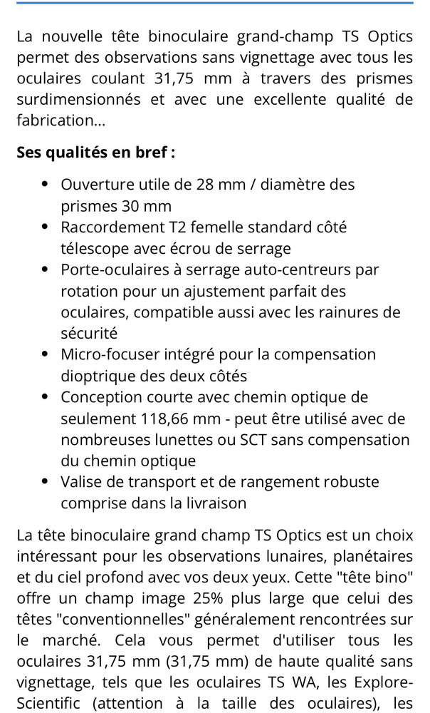 24. Bonjour a tous. Ayant vendu mon ancien matos (setup Vespera) je souhaite me réorienter sur du visuel à l'oculaire. J' ai décidé de partir sur une lunette TS 125 / 975 doublet apo photoline. Je dispose déjà d'une monture Omegon Twinmaster (2 X 13 kgs) d'un MAK 127 avec un boitier Memstar et 3 oculaire Explore scientific (24mm 68°:14 et 8.5 mm en 82°). Idéalement pour du visuel pur et dur le Dobson est le choix de la raison, seulement : - je vis dans une zone avec pas mal de pollution lumineuse - pas envie de me déplacer avec 50 kg de matos alors que j'ai un jardin - j'ai déjà une monture altaz - facilité de la lunette par rapport a la collimation - je suis un fan de l'objet en lui même ! Je passerai ma commande mi Mars, seulement j'hésite encore sur un point : Tête Binoculaire Baader maxbright 2 / TS grand champ vendues chez PA ou des oculaires APM 100° (ou autre marque). Je suis attiré par la tête bino mais j'ai cru comprendre qu'on perdait de la luminosité et par rapport à ma fameuse pollution lumineuse... Y'a t il des utilisateurs de ce type de setup pour me conseiller ? Que penser de ce type d'oculaires 100° / 110° sur une lunette ? Question subsidiaire : avec ces deux bino, peut on y monter des oculaires grand champ dessus ou faut il rester sur des 60°/ 65° ? Merci à vous !