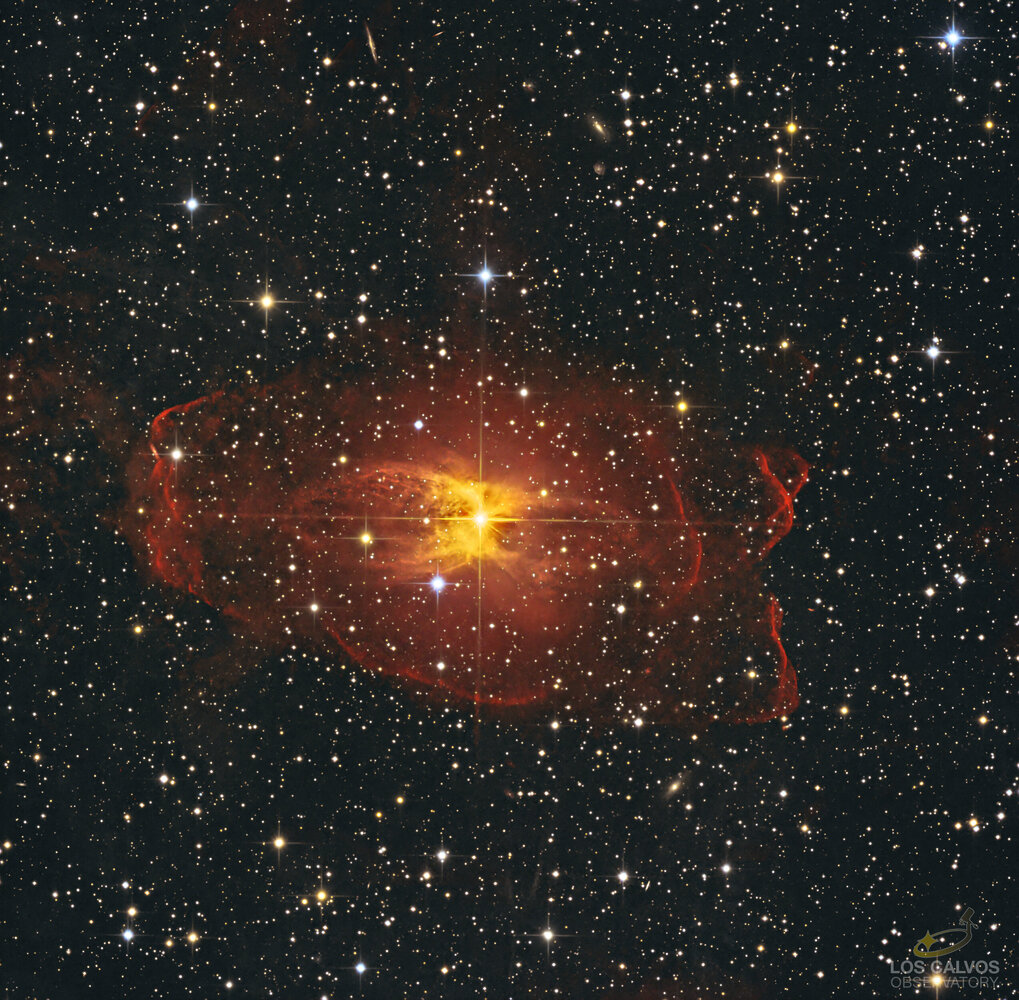 IC 2220 et son enveloppe Ha c'était l'une de nos premières cibles avec cette configuration en 2019. J'ai récemment observé des images avec une coquille Ha autour de l'objet, j'ai donc décidé d'ajouter une session LRGB et une longue session en Ha, car le signal Ha n'est si fort que cela. Un nouveau traitement a été effectué avec une nouvelle méthode et de nouveaux outils. Le résultat est donc très différent et très esthétique (à mon avis). L'ancienne version se trouve dans la version B. (https://astrob.in/ca07yn/0/) Peu d'objets du ciel profond révèlent leurs vraies couleurs aussi clairement que la nébuleuse de la Jug de Toby. Cette nébuleuse par réflexion entoure l'étoile orange brillante HR 65750. La poussière que nous observons serait le flux de matière émis par HR 65750, reflétant la couleur de l'étoile. Cet orange vif se détache nettement dans le champ et est facile à observer avec des ouvertures modestes. La nébuleuse est non seulement bipolaire, mais aussi biconique. Le Toby Jug se situe à 300 années-lumière de nous. Full & details sur astrobin : https://astrob.in/u2do9s/0/ URGENT : ce set-up est à vendre installé au Chili (observatoire El-Sauce), si vous êtes interéssé, contactez moi : rediger@hotmail.fr