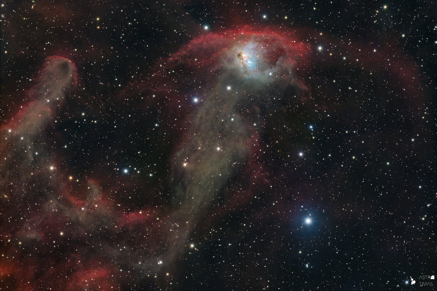 NGC 1788 Bien que ce nuage fantomatique soit plutôt isolé des étoiles brillantes d’Orion, leurs vents puissants et leur lumière ont un fort impact sur la nébuleuse, forgeant sa forme et en en faisant un foyer pour une multitude de soleils naissants. Les nébuleuses sombres Lynds 1616 & à gauche de la nébuleuse apportent un aspect « fantasmagorique au cliché ». NGC 1788 est une nébuleuse à réflexion inhabituelle (blanc bleuté à droite de l’image) entourée d’un anneau rouge brillant d’hydrogène gazeux. Les étoiles à l’intérieur de la nébuleuse n’ont qu’environ un million d’années, ce qui est très jeune par rapport à la plupart des étoiles. L’anneau d’hydrogène gazeux incandescent est alimenté par des étoiles chaudes et massives à proximité qui ne sont pas obligatoirement visibles sur l’image. L’image est une L – RhaGB Full & details sur astrobin : https://astrob.in/9pj2v6/0/