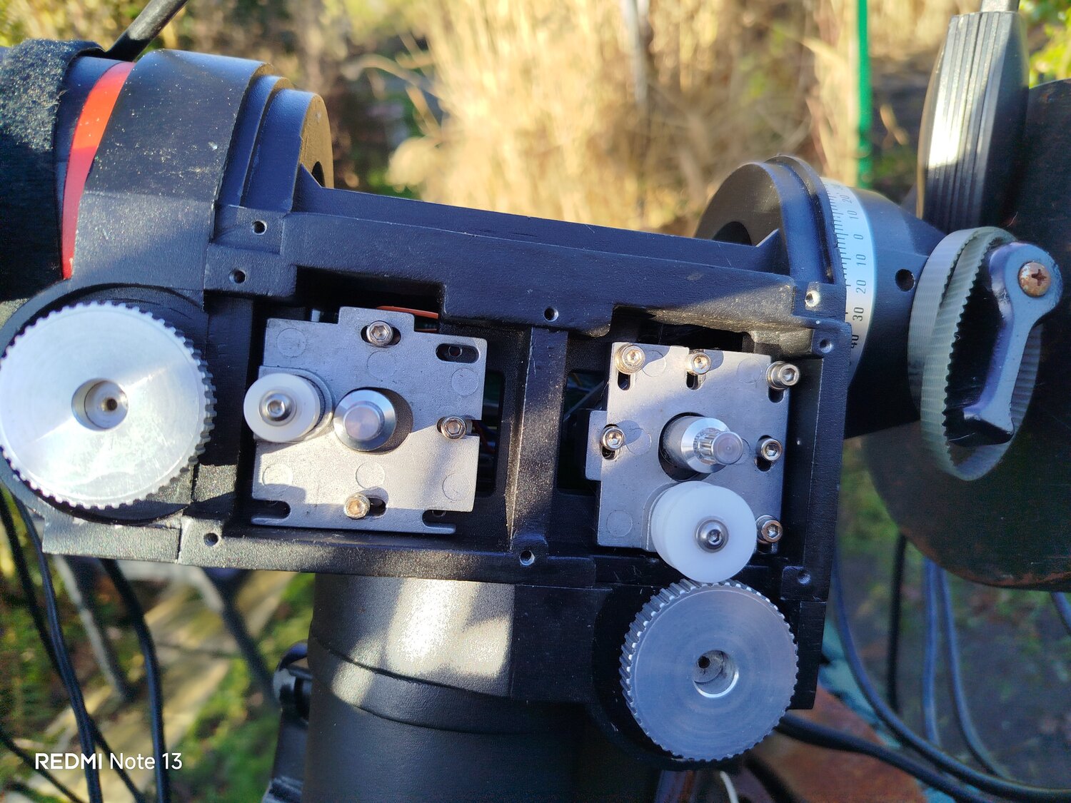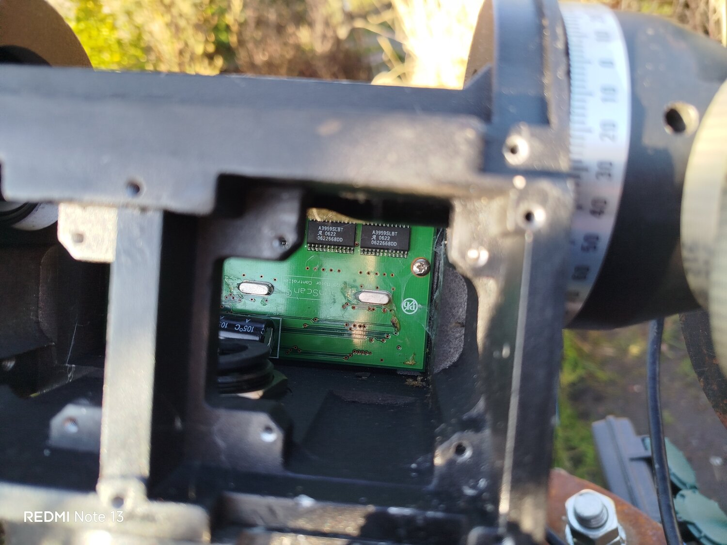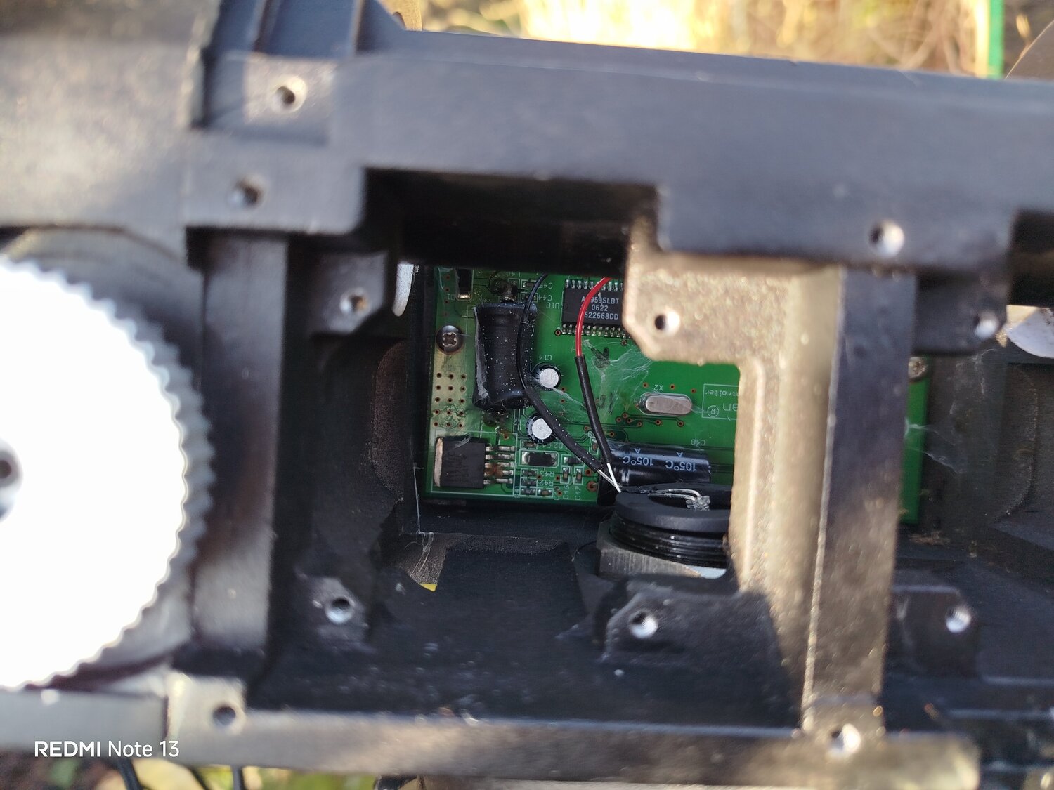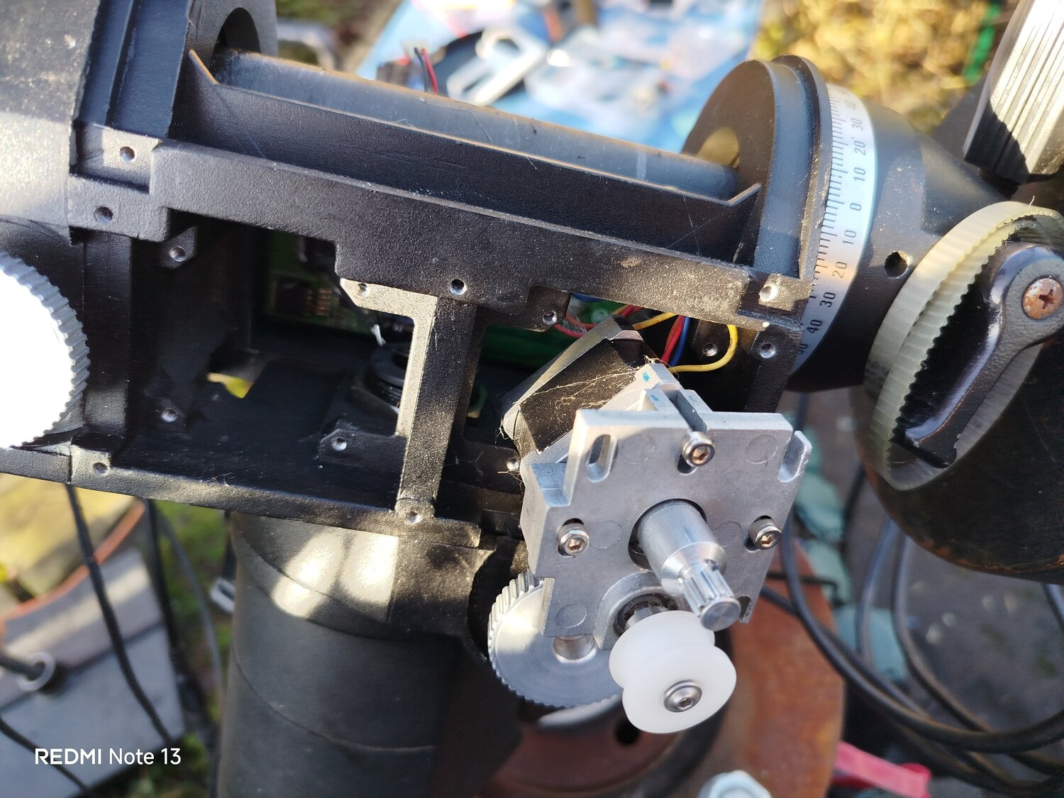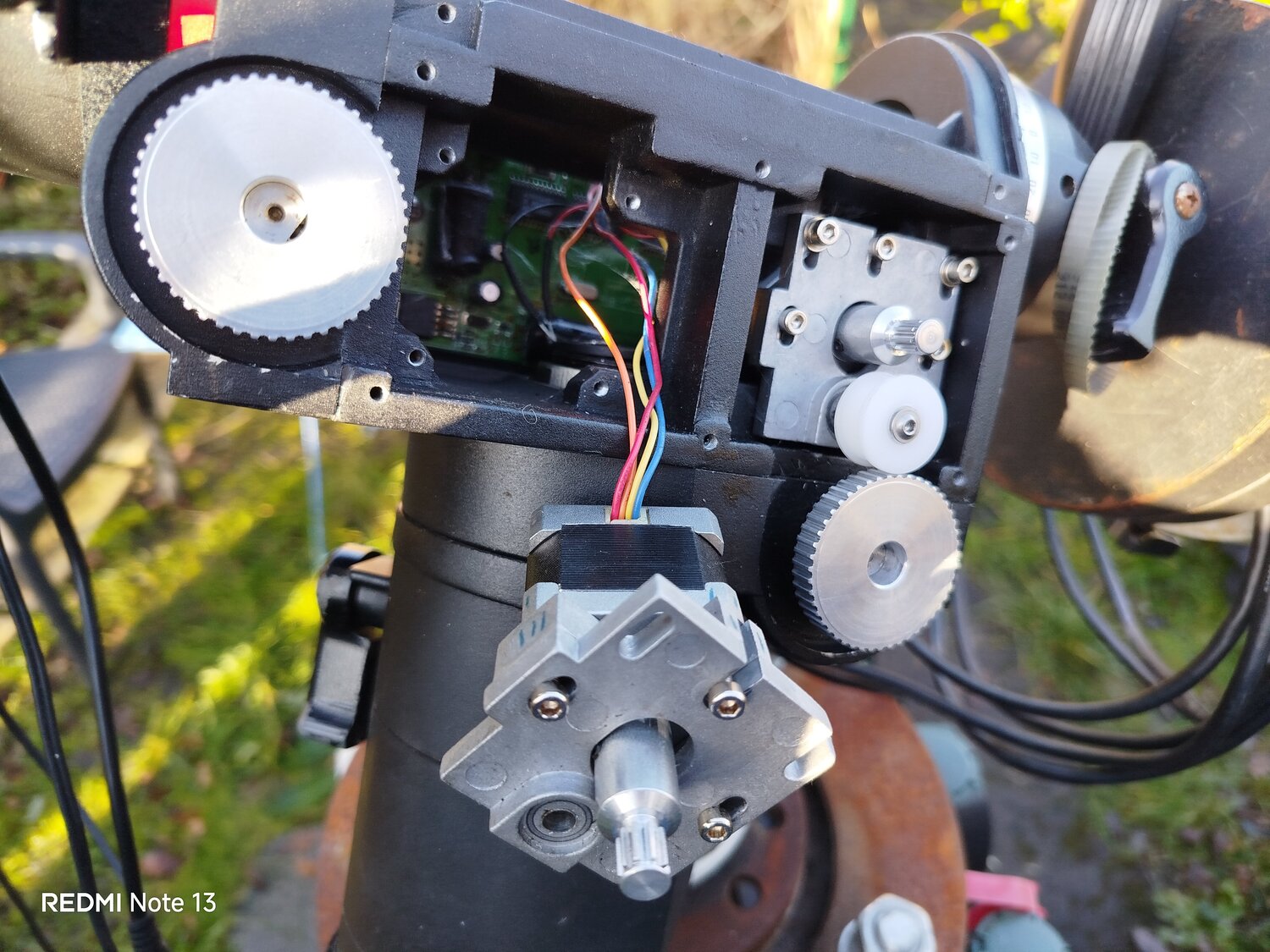 3. Alors démontage du mécanisme de la monture sur place, sans enlever le scope. J'ai nettoyé toutes les pistes et contacts avec coton tige et alcool 70°. Branchement uniquement de l'électronique...ben flûte alors, la diode rouge s'allume. Aller hop on remonte le bouzin. Test ok avec la raquette de commande. Ouf sauvé. Si besoin Pierro Astro à la carte d'alimentation et la carte mère dispo. 🤘 J'ai vu en même temps que la courroie en AD fait un peu la tronche. Vais en commander un jeu par sécurité. Mais normalement ce soir ça devrait le faire. Test du C8 à pleine focale.