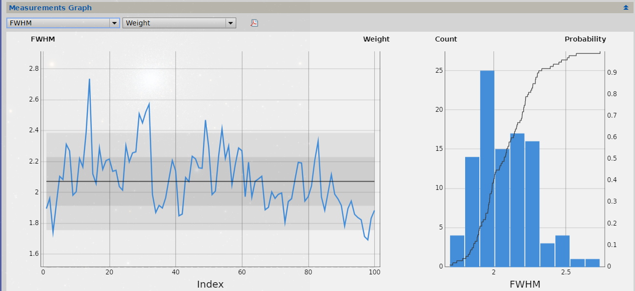 5. Ca dépend des nuits évidemment mais dans l'ensemble pas trop mal j'ai souvent du 2.3-2.5". En l'occurence pour M13 c'était très bon parce que j'ai un fwhm médian 2-2.1" (sur 3 nuits) d'après le subframe selector (à 0.92"/px): Mon balcon est au 6ème étage de mon bâtiment je ne sais pas si ça aide. C'est sur un crop très resserré oui pour exclure au mieux les étoiles qui ne sont pas de l'amas