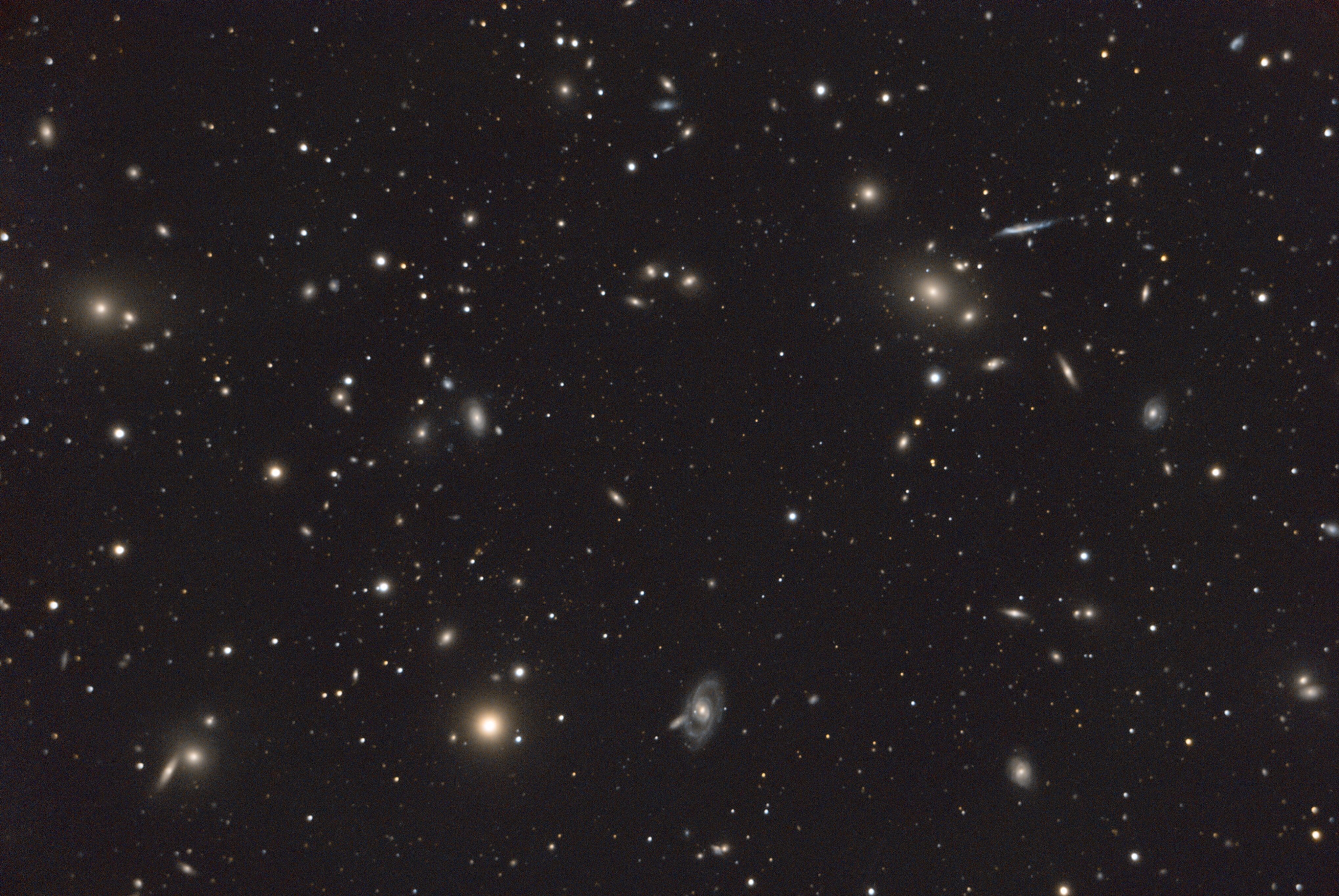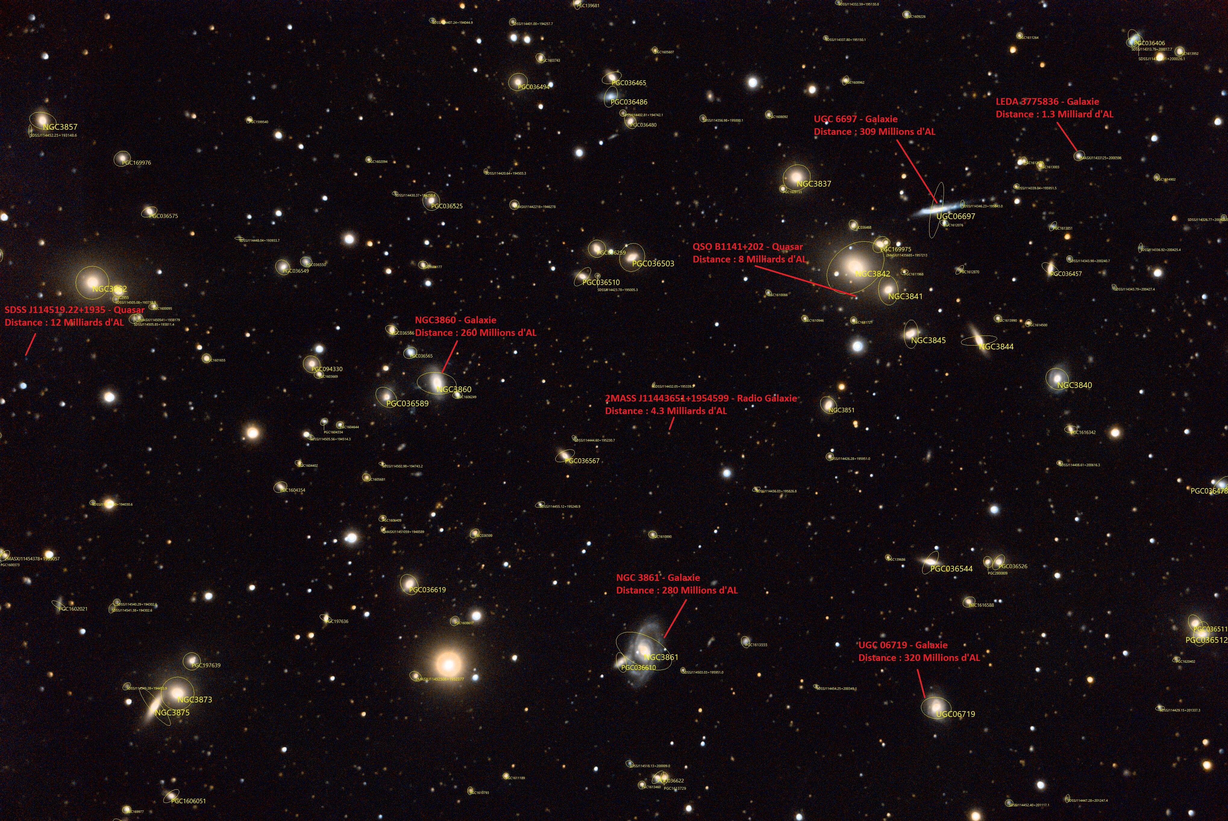 Bonjour à tous, Après Abell 1656, voici Abell 1367 dans la chevelure de Berenice, Setup C8 + ASI294 MC Pro + réducteur 0.63 (focale 1580mm) sur EQG Quidage lunette Orion 80x400 + ASI462 Acquisition NINA Traitement SIRIL + GraXpert + GIMP Pose unitaire de 180s, 5h au total 50DOF Je suis passé par ASTAP pour avoir les annotations (merci @sebseacteam et par Aladin pour les données permettant le calcul des distances (redshift, vitesse radiale) j'étais étonné de trouver des galaxies aussi lointaines et j'ai douté des calculs mais jai verifié quelques distances sur internet/simbab, etc. et elles ont l'air correct, en tout cas pour celles que j'ai pu vérifier A+ Manuel.
