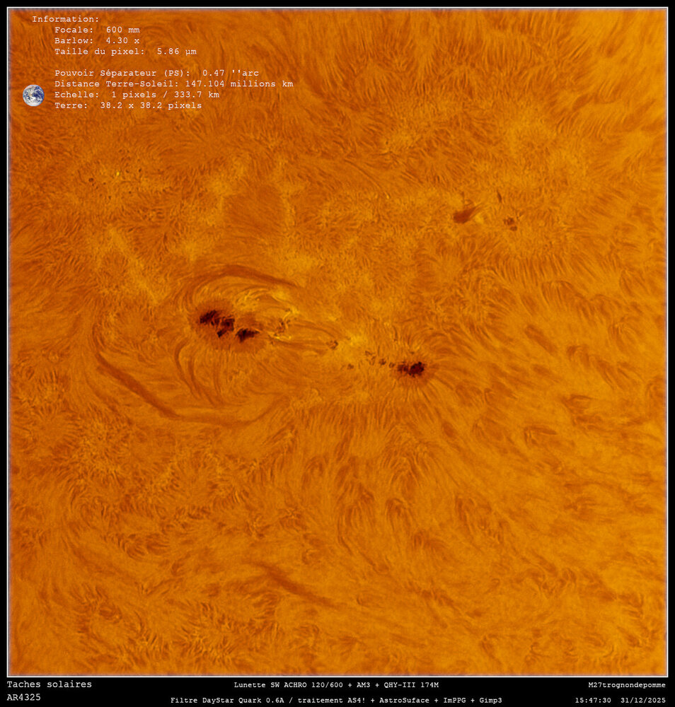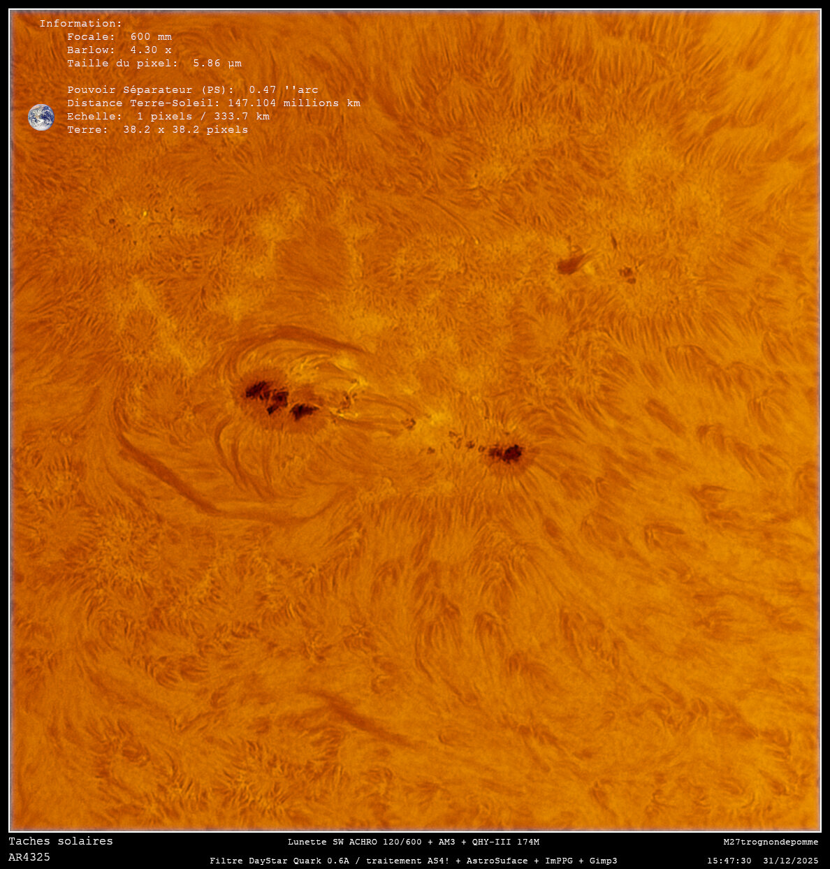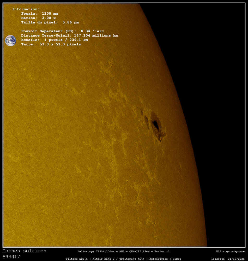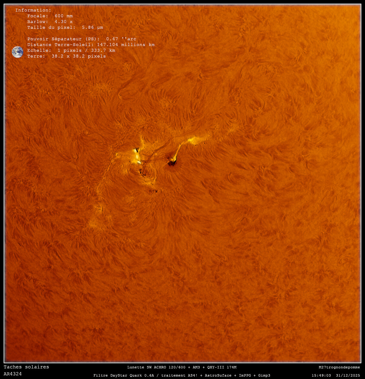 Absolument splendide de détails et de contraste, tout comme le set up! Ça aurait valu le coup de scier le sapin du voisin, je l'ai observé une heure et demi plus tard et y'a eu une éruption dantesque autour de la tache au nord ouest. Bon après faut gérer l'ire du voisin -