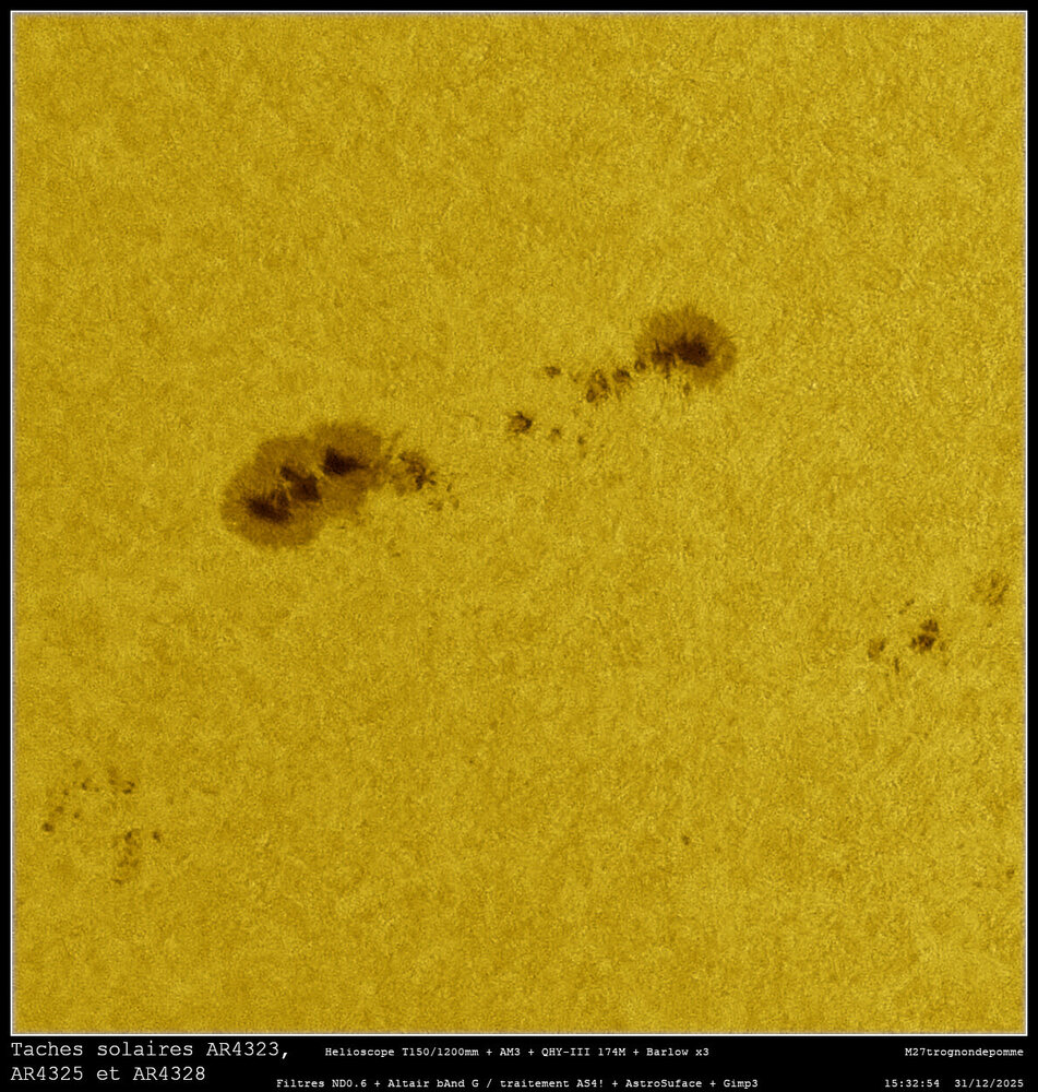 Moi aussi , je poste mes dernières images LB et HA du soleil pour 2025. Conditions médiocres : bourrasque de vent. En lumière blanche ( filtre Altair Band G ) : Du Ha au Daystar Quark : Bon réveillon aux soleilleux -