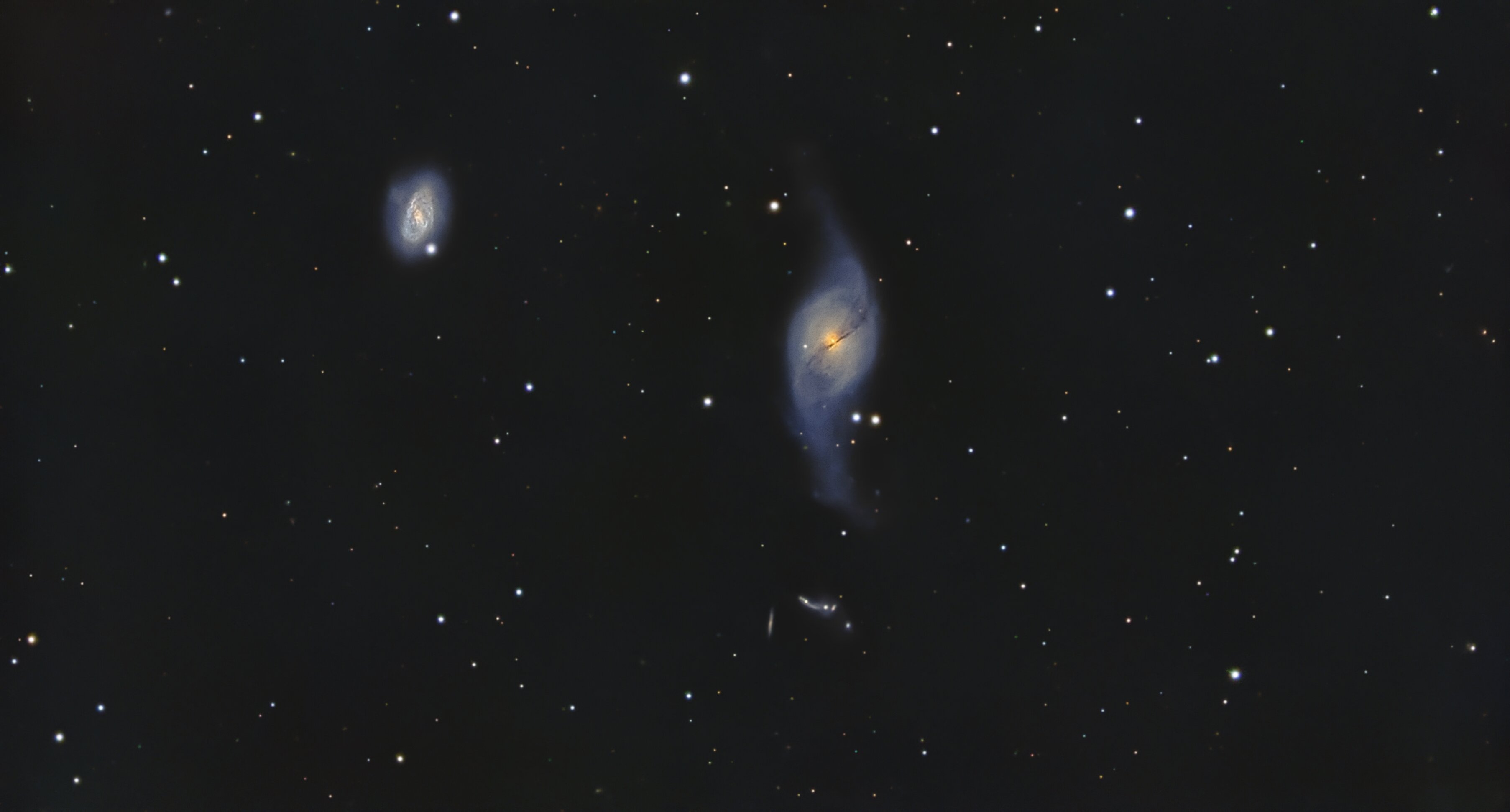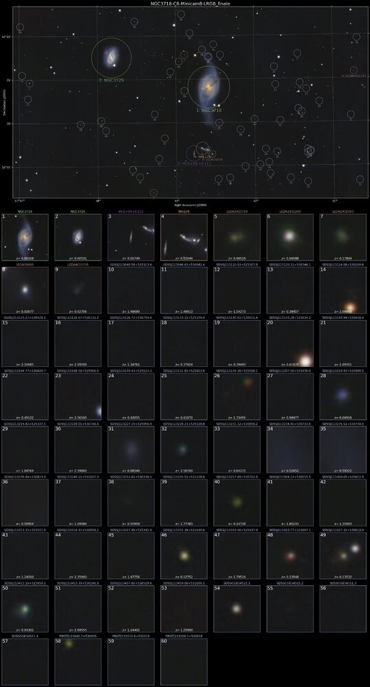 Hello, Suite des images récoltées ces dernières semaines... Retour sur une galaxie elle aussi particulière , déjà faite par le passé. NGC 3718 est une vaste galaxie spirale barrée située dans la constellation de la Grande Ourse. NGC 3718 a été découverte par l'astronome germano-britannique William Herschel en 1789. SCT Celestron C8 (203/2000) + réducteur Antares 0.63x + réducteur TS CCD47 0.67x focale @ 881mm f/d 4.3 Caméra QHYminicam8 mono Monture HEQ5 kit courroie Rowan Autoguidage via lunette guide 60/270, Asi290mm / PHD2 Acquisition NINA L= 414 x 30s R= 63 x 60s G= 68 x 60s B= 69 x 60s Mode Full Gain 82 offset 30 T° -10°C Pré-raitement Sirilic/Siril , Pixinsight. SetiAstroSuite Pro. Une brute de 30s filtre L: -
