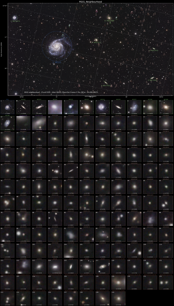 Bonjour à tous, Après Abell 1656, voici Abell 1367 dans la chevelure de Berenice, Setup C8 + ASI294 MC Pro + réducteur 0.63 (focale 1580mm) sur EQG Quidage lunette Orion 80x400 + ASI462 Acquisition NINA Traitement SIRIL + GraXpert + GIMP Pose unitaire de 180s, 5h au total 50DOF Je suis passé par ASTAP pour avoir les annotations (merci @sebseacteam et par Aladin pour les données permettant le calcul des distances (redshift, vitesse radiale) j'étais étonné de trouver des galaxies aussi lointaines et j'ai douté des calculs mais jai verifié quelques distances sur internet/simbab, etc. et elles ont l'air correct, en tout cas pour celles que j'ai pu vérifier A+ Manuel.
