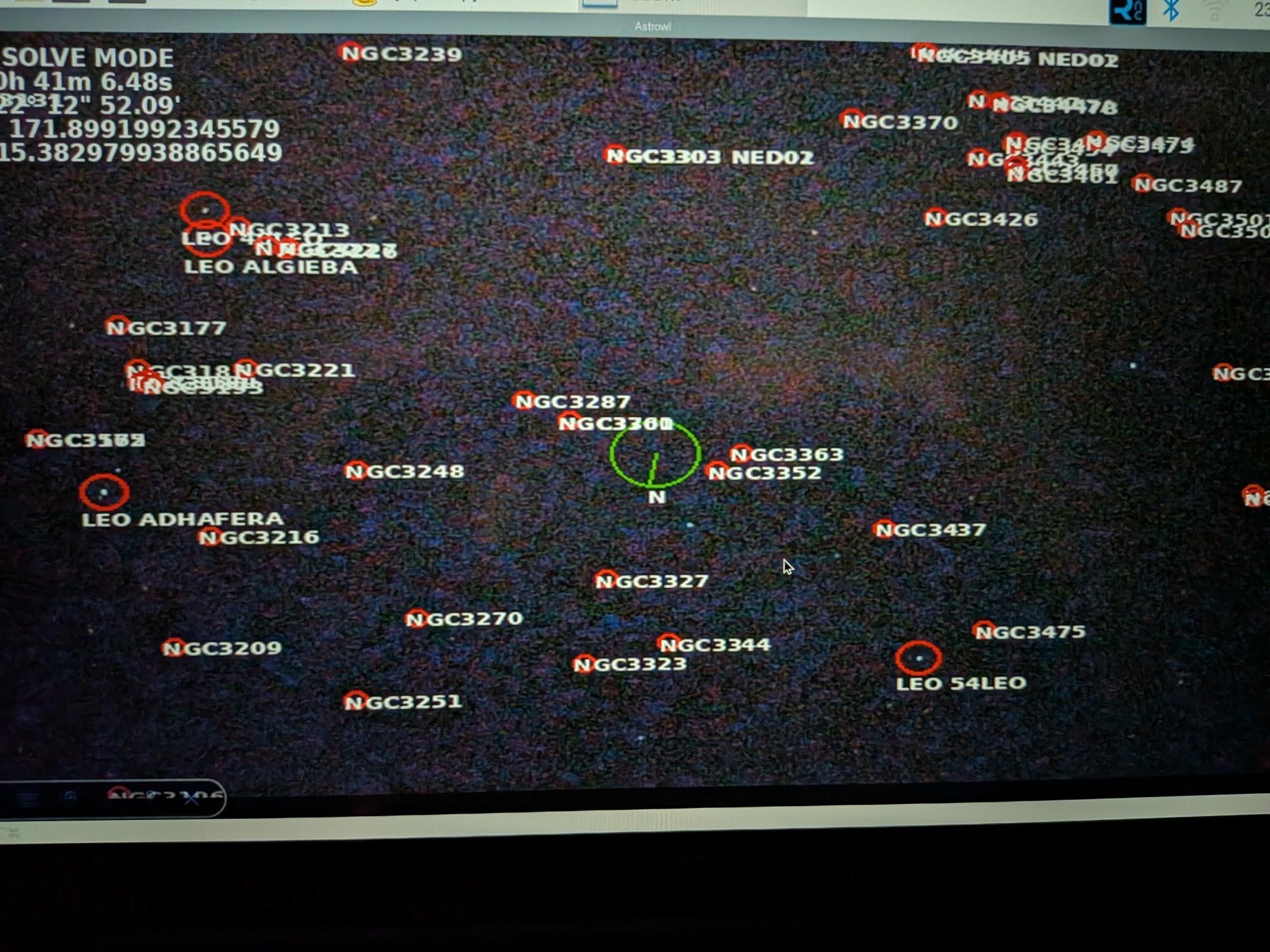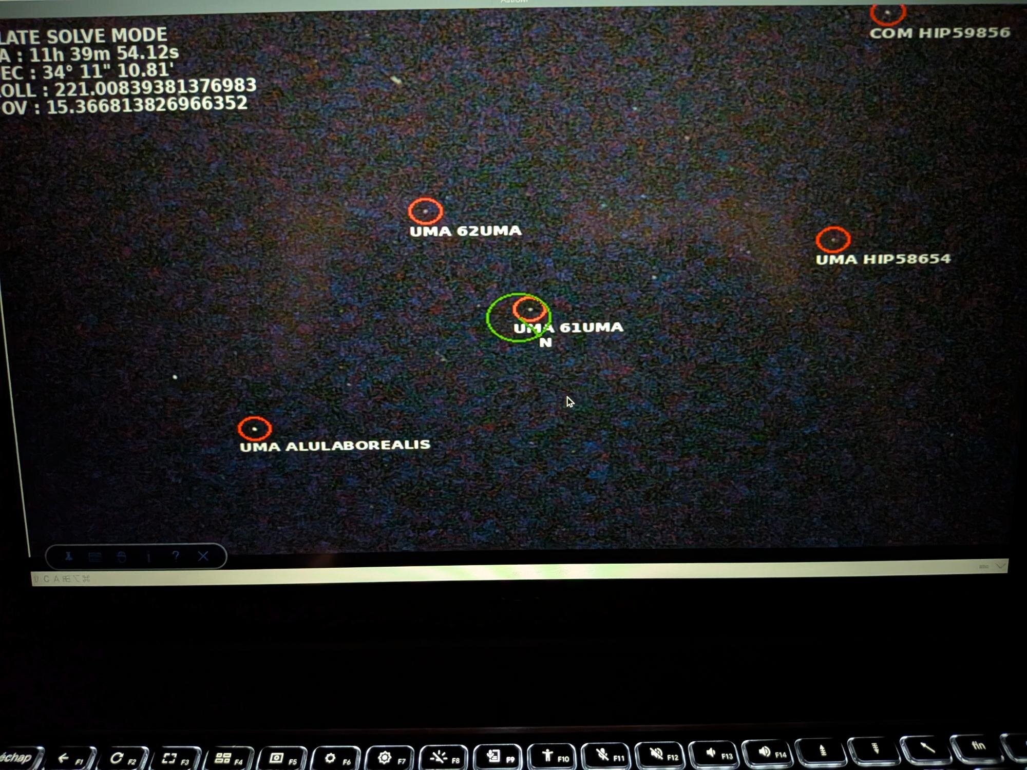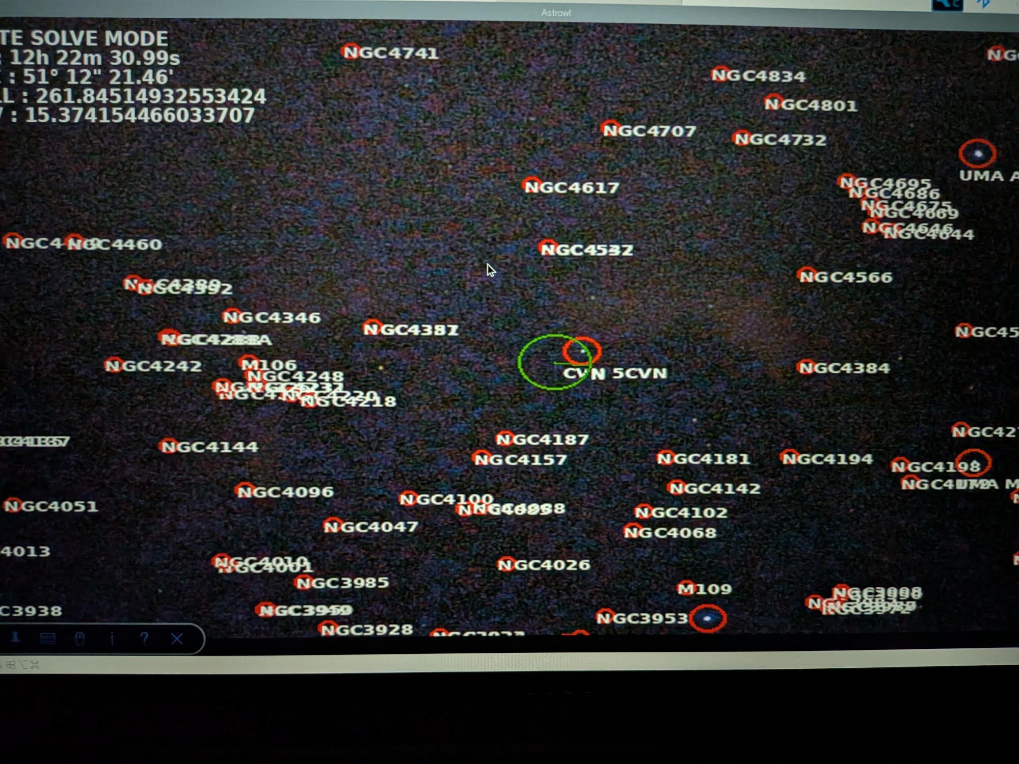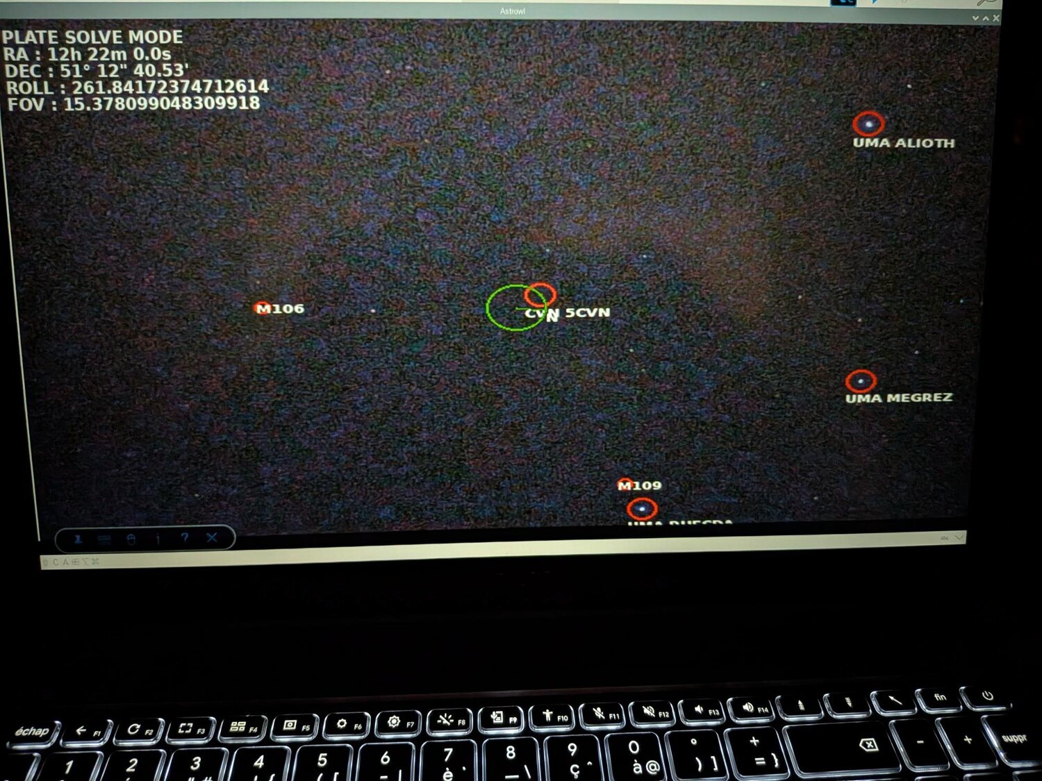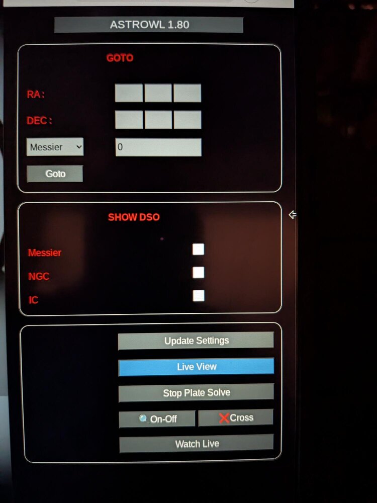 L'ajout du plate solving sur l'AstrowlBox est quasiment abouti ! Un premier test sur le ciel pollué hier a permis de sortir des résultats très probants. C'est vraiment bluffant. L'avantage c'est que tout est embarqué dans la box, pas besoin de logiciel tiers, du genre SkySafari ou autre. J'étais parti sur un simple repérage du ciel au début et il est dores est déjà possible d'afficher le nom des étoiles (les principales), les objets des catalogues Messier, NGC, IC présents dans le champ (ce qui peut faire du monde !), les coordonnées célestes du centre de l'écran, le FOV, la direction du pôle nord céleste (cercle en vert au milieux de l'image). L'interface utilisateur est également bien aboutie, je dois encore finaliser la possibilité de faire du push to vers des coordonnées ou des objets Messier, NGC et IC. Il faut ajouter une petite camera sur le port USB, le capteur IMX585 ne peut pas servir au plate solving car je n'ai aucune maîtrise sur le champ. Il reste donc encore la création d'un petit boitier pour accueillir la caméra USB qui puisse se mettre dans le sabot d'un chercheur et être collimatable et le développement de la fonctionnalité Goto. Ca fait encore un peu de boulot, mais le gros est déjà derrière moi. Il faudra aussi faire une mise à jour complète du logiciel de la box (installation du fichier image), car de nouvelles librairies sont utilisées. Quand tout sera finalisé, je ferai une communication à part entière -