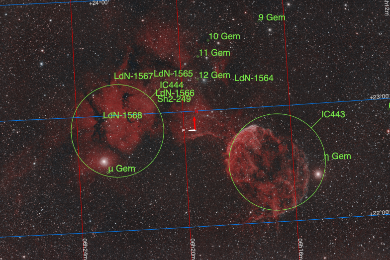 Avec presque un an de retard, permettez moi de vous présenter ma tentative sur la Méduse Cible: Nébuleuse de la Méduse (IC443) Rémanent de supernova, située dans la constellation des Gémeaux, accompagnée dans le cadrage de IC444 Capture (06/04/20225) - 60 poses de 180 secondes - prises de vues à gain 125, offset 25, température -10°C - DOF 50/50/50 Le setup: - monture SW AZ-EQ6 - lunette SW Equinox 80/500 - correcteur réducteur x0.8 TRF-2008 - camera PlayerOne Poseidon-C - guidage au diviseur optique avec ASI290mini - filtre HA+Oiii(Altaïr) - Kstars/Ekos/Indi sur un raspberry pour piloter le setup Traitements: - pre-traitement via Sirilic / Siril (retrait du gradient effectué sur la séquence lors du pré-traitement) - traitement Siril -- Debruitage GraXpert (via script Siril) -- Etirement Hyperbolique Généralisé -- Retrait du bruit vert -- post traitement Gimp (MakeDarkSky via plugins PyGapM27, courbes) L'image présentée est en jpeg, réduite en taille (hauteur et largeur divisées par 2) Résolution astrométrique Cordialement, Stéphane -