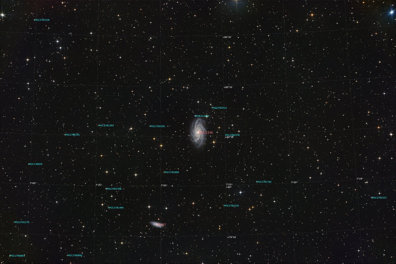 Salut, dernier shoot de cette nouvelle lune car dernière nuit exploitable dans les Alpes, NGC2336 issue de 37 poses de 240Sec. la crop d'abord: la full avec sa collègue IC467: et la version annotée: A vos commentaires a+ Serge