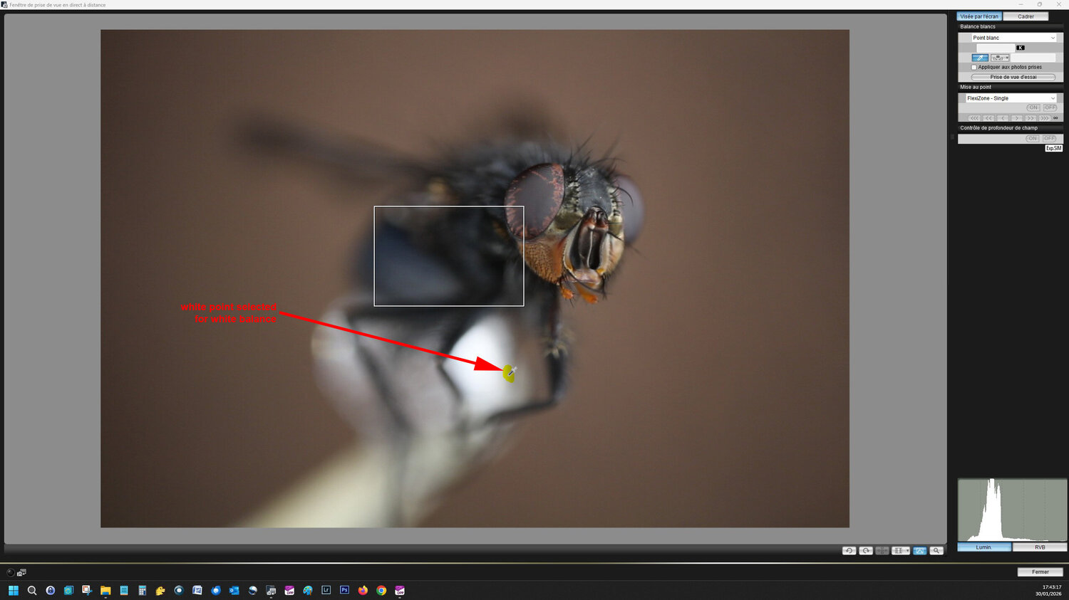 Bonjour les ami(e)s, Comment vas-tu mieux mon cher Charles ? Je vous partage la même mouche commune, prise aussi au banc macro, avec l'objectif Lomo 3,7x et une bague allonge de 13 mm mais le tout sur mon Canon 1200D défiltré pour l'astro, qui a moins de 1000 déclenchements alors que mon autre 1200D non défiltré arrive à plus de 40000 déclenchements. Je me disais que c'était dommage de ne pas utiliser le 1200D défiltré. J'ai juste fait un point blanc dans le logiciel Canon EOS Utility 2 pour corriger la dominante rouge induite par le défiltrage du 1200D : Image stackée à partir de 144 photos dans Hélicon focus avec la méthode C et lissage à 1. Je suis assez content du résultat dans le sens que l'on ne perçoit pas la dominante de rouge, ce qui va me permettre d'utiliser aussi mon 1200D défiltré. PI : sans la balance du blanc : Avec : Amitiés, FRanck