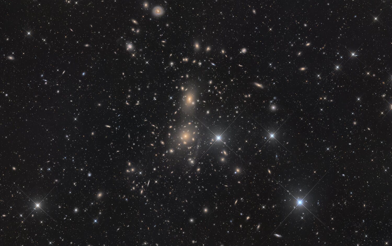 D'après Wikipédia, il y a plus de 1 000 galaxies. Il n'y en a probablement pas 1 000, mais certainement un nombre considérable. 2 x ASI 2600MM pro Axis Instruments Hyperbolic Astrograph 280mm F:3,5 10m GM2000 Lum 1092x30 sec Newton CFF 200 F5 Avalon Linear RGB 3x132x120 sec Software SGPro, PI & PS CS6. https://app.astrobin.com/u/Vandewattyne?i=4c0dm6#fullscreen