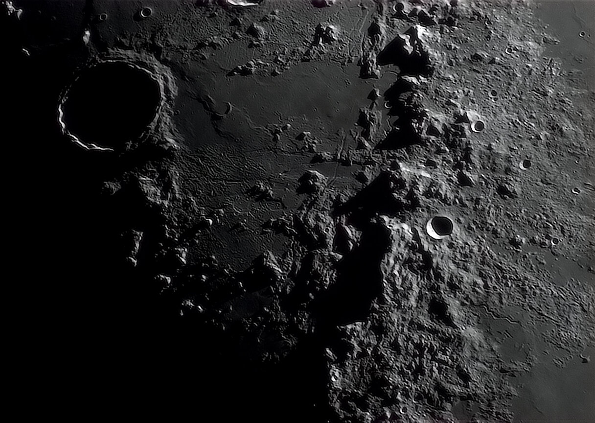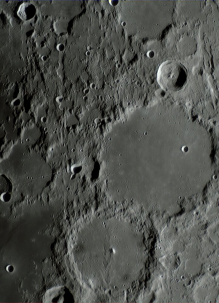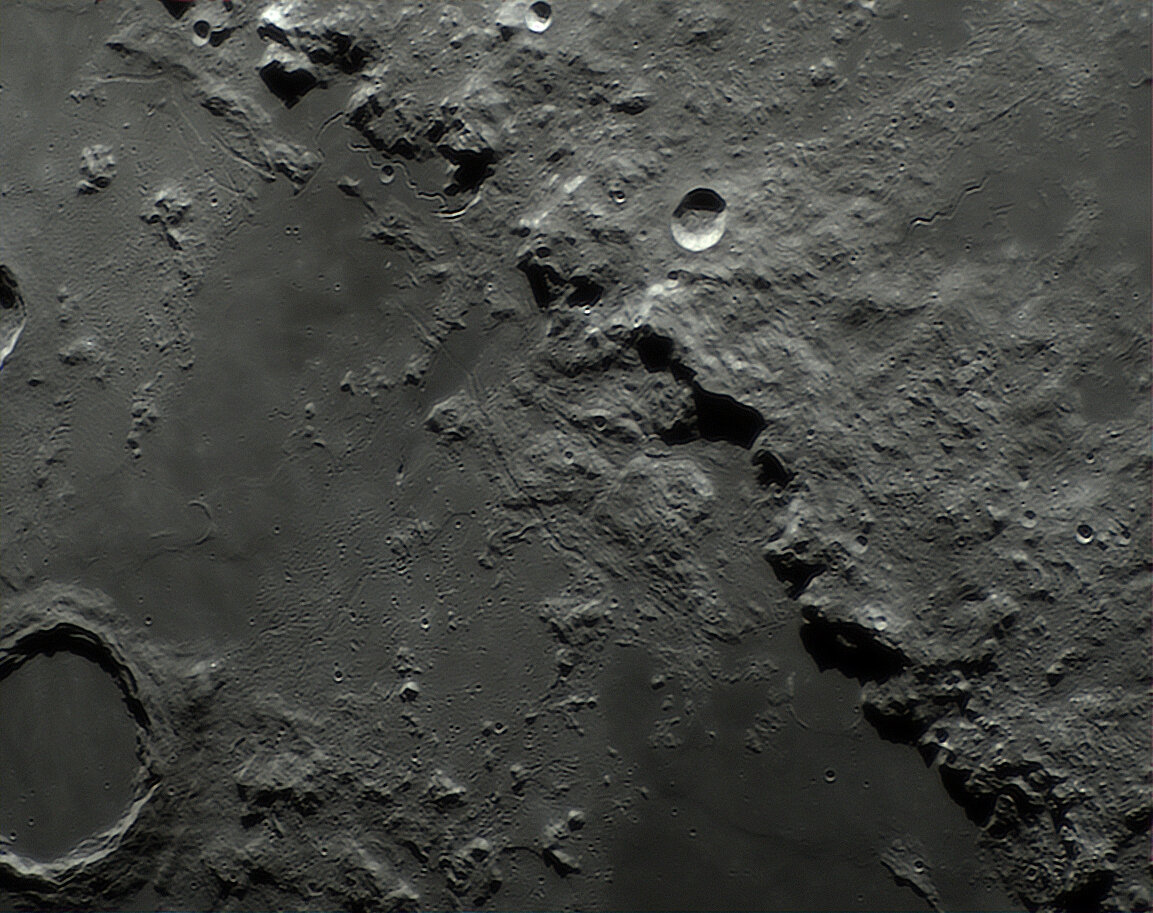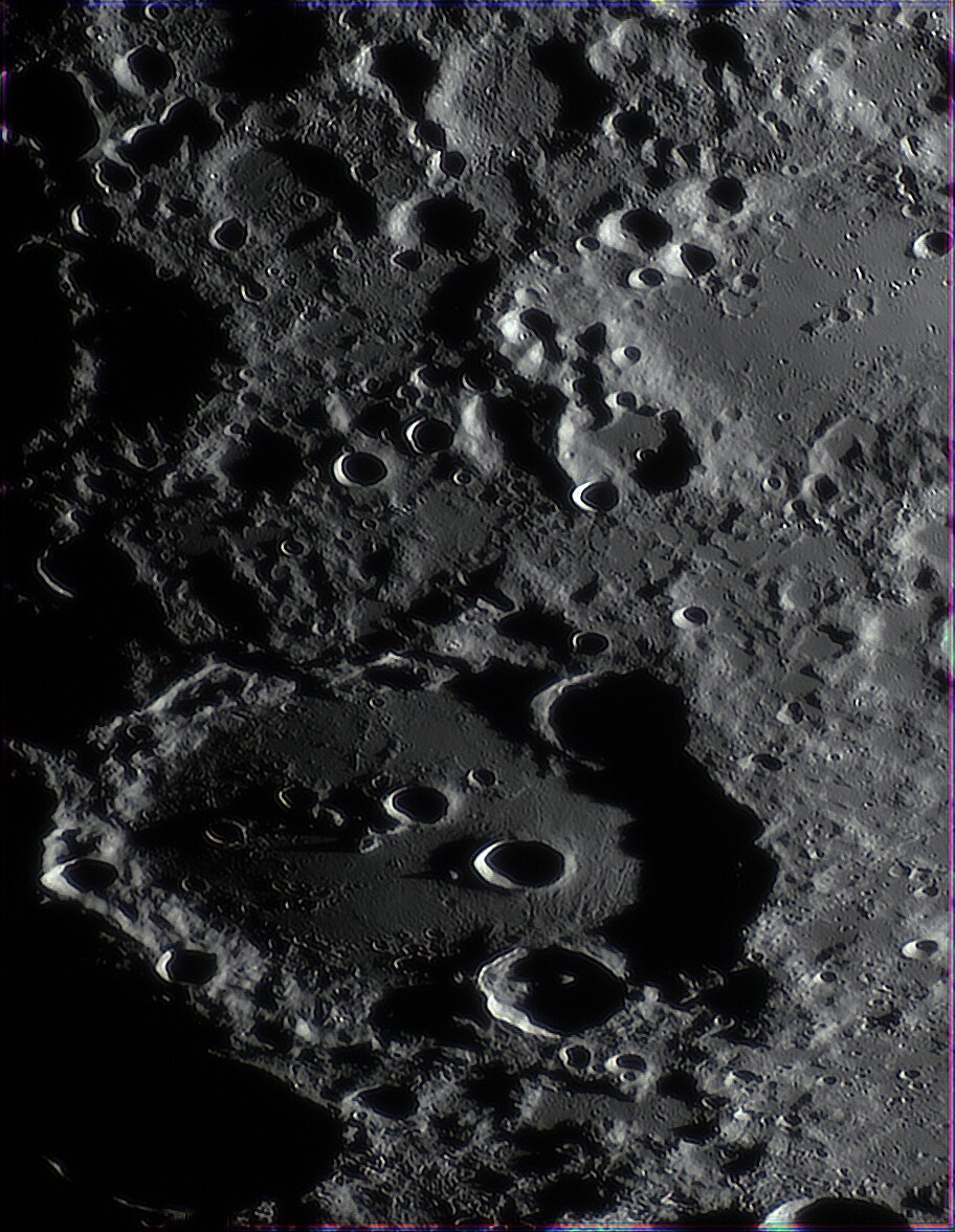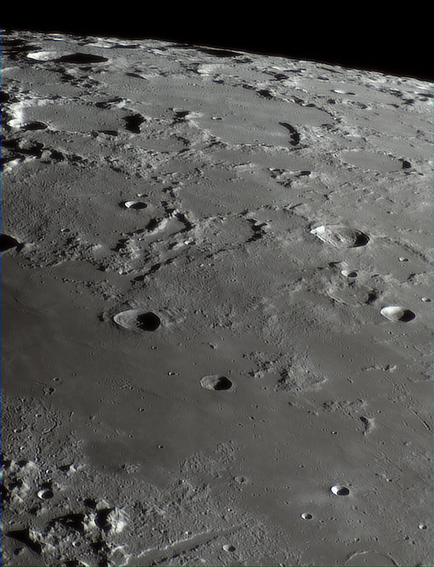 5. Bonjour, Voici quelques images lunaires effectuées les 27 et 28 décembre au Newton 200/1000, Barlow x3, caméra ZWO ASI 224C. Logiciels FireCapture, AS!4, AstroSurface, Gimp. Malgré le froid qui figeait fréquemment l'écran de mon ordi, les conditions étaient très bonnes pour les prises de vue (transparence excellente, turbulence faible et peu d'humidité). Films d'environ 7000 images, autour de 20% conservées. Pose de +-6 ms et gain à 300 environ. Le 27, quelques images proches du terminateur donc assez contrastées. Traitement un peu sombre mais j'aime bien en définitive. Echant 0.214 "/px. Vallée des Alpes : Rima Hadley : Triesnecker : Ptolemaeus à Werner (mosaïque ICE de 2 imgs) : : Autour de Licetus : Le 28 décembre, échantillonnage 0.184"/px. Lune Nord vers Meton : Rima Hadley (encore ! mais tellement chouette ... ) : Rima Hadley 3D : Ptolemaeus : Clavius : Un Clavius "comme vu de face " (transformation de l'image précédente) : Sud, cratère Pentland au centre : Bon visionnage A+ GO