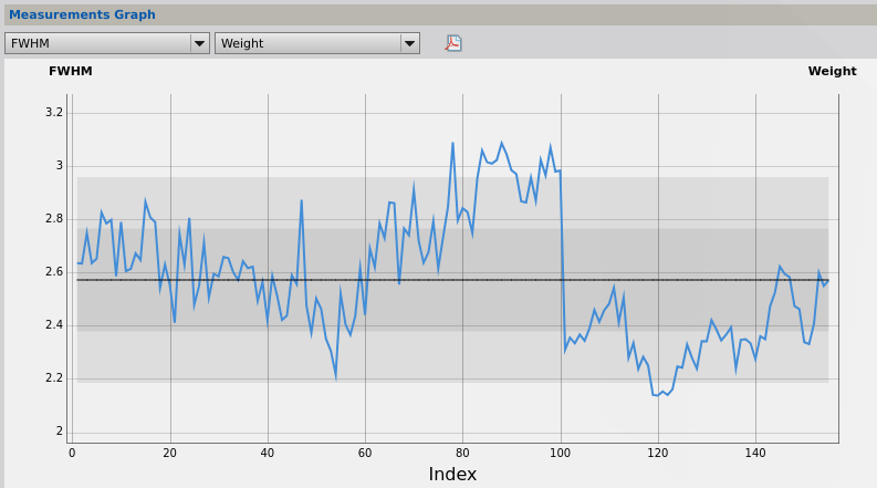 Merci à tous pour vos commentaires. Je vais retravailler sur une nouvelle version Ma session était dans la nuit de mardi à mercredi, tu parles bien de cette nuit-là ? J'étais à une centaine de km de Paris vers le sud, le long de l'A10 et je n'ai pas trouvé les conditions trop mauvaises. Mon guidage était très bon (cela dit cette cible est haute en déclinaison ce qui facilite le guidage) et les chiffres de seing donnés par l'Asiair étaient toujours bien inférieur à 3". Voici l'analyse de mes subs avec Pix (SubframeSelector) Pour le SNR on constate la chute dramatique qui correspond à l'apparition de la buée sur le secondaire... Pour la FWHM (en arcsec): La chute brutale de la valeur du FWHM autour du sub n°100 correspond à un ajustement de la mise au point que j'ai fait à ce moment-là. C'est très rarement nécessaire avec ce tube en carbone et cela correspond au moment où la buée est apparue. Et bizarrement le meilleur seeing a été à partir de ce moment-là (bien que ces subs soient largement inexploitables) Je me demande s'il peut y avoir un lien de cause à effet? Avec quoi tu mesures ton HFR que je puisse comparer ?