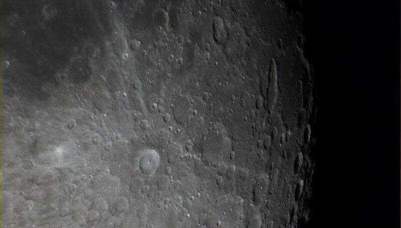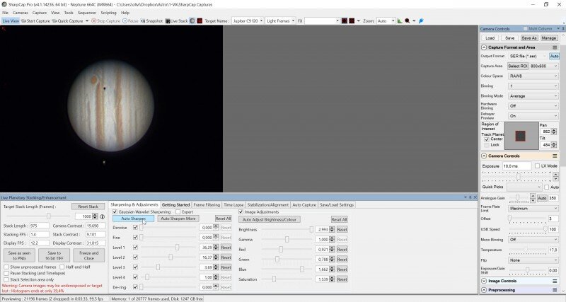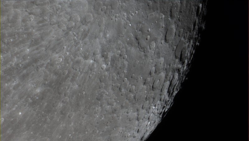 La 664 est super en planétaire, son grand champ est sympa pour la lune et bien aidant pour trouver la planète quand ton Goto te met un peu à côté de la cible (et c'est galère à trouver, une planète, quand on est à côté !)... En planétaire, on ne se prend plus la tête maintenant, on vise f/20... Il existe plein de calculs compliqué pour trouver la focale nécessaire (donc la barlow dont on a besoin), et aujourd'hui ces beaux articles se concluent par la petite phrase : "...mais maintenant, on vise f/20 et jusqu'à f/30 maximum" (!!? du coup, pourquoi je me suis pris la tête à calculer la barlow ??). Bref... d'un côté, c'est plus facile J'ai aussi le Mak 150 SW. En natif, c'est vrai que c'est un peu court, et à x2 un peu beaucoup. Une barlow x1.5 serait bien, surtout si elle permet de grossir un peu plus en allongeant le backfocus. Comme @krotdebouk te l'a expliqué, en planétaire on n'utilise que Firecapture ou Sharpcap... Perso, par flemme, je n'utilise plus que Sharpcap, depuis qu'il permet de "livestack" planétaire, donc l'empilement des images en direct, comme pour le ciel profond, mais pour la lune et les planètes ! C'est extra : plus besoin d'attendre pour voir ton image. "Snapshot" (donc l'image telle que vue en direct) Vu le peu de différence qu'il y a avec une image traitée, je m'en contente souvent (L'image traitée est plus fine, moins bruitée, mais si je la montre à la famille, personne ne voit la différence !) Tu vois qu'elle fonctionne bien, la 664C (Player-One pour ma part, car je n'aime pas ZWO 😛 mais ça ne change rien au capteur) Ou la lune (toujours vue en direct, Mak à f/12 + 664C) : Tout ça pour dire que c'est sympa d'avoir les images en direct, plutôt qu'être obligé de les traiter pour voir ce que ça donne Sans barlow pour la lune, pour ma part, pour avoir plus de champ. Par contre, j'ai toujours un ADC (pour rectifier l'alignement des couleurs). Et pour ton filtre UV-IR, tu avais vérifié si ta caméra n'en avait pas déjà un ? La plupart des caméras ont un filtre UV-IR direct devant le capteur... mais peut-être pas la ZWO ? -