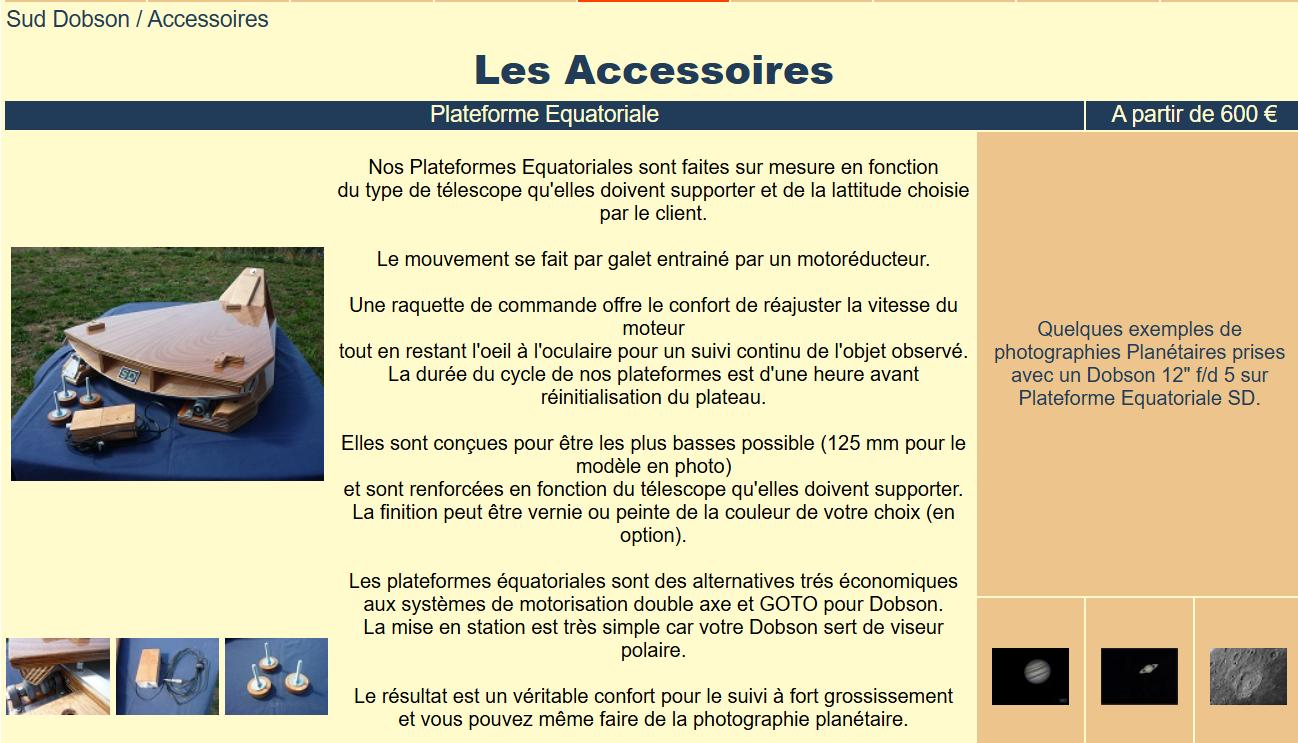 Tout à fait d'accord, c'est très cher pour moins de stabilité surtout en planétaire ou l'image doit rester stable pour trouver une mise au point parfaite, déjà pas simple avec un schmidt sans motorisation Cela ne vaut vraiment pas el coup d'achat La table équatoriale est un meilleur choix , tu auras un suivi pendant environ une heure pour 500 à 600 euros neuf ou encore mieux comme tu es bricoleur Sud Dobson/Accessoires , je l'avais sur mon dobson 300 suivi sans problème