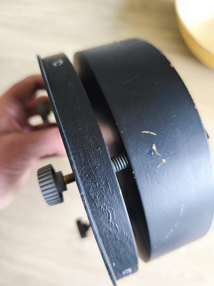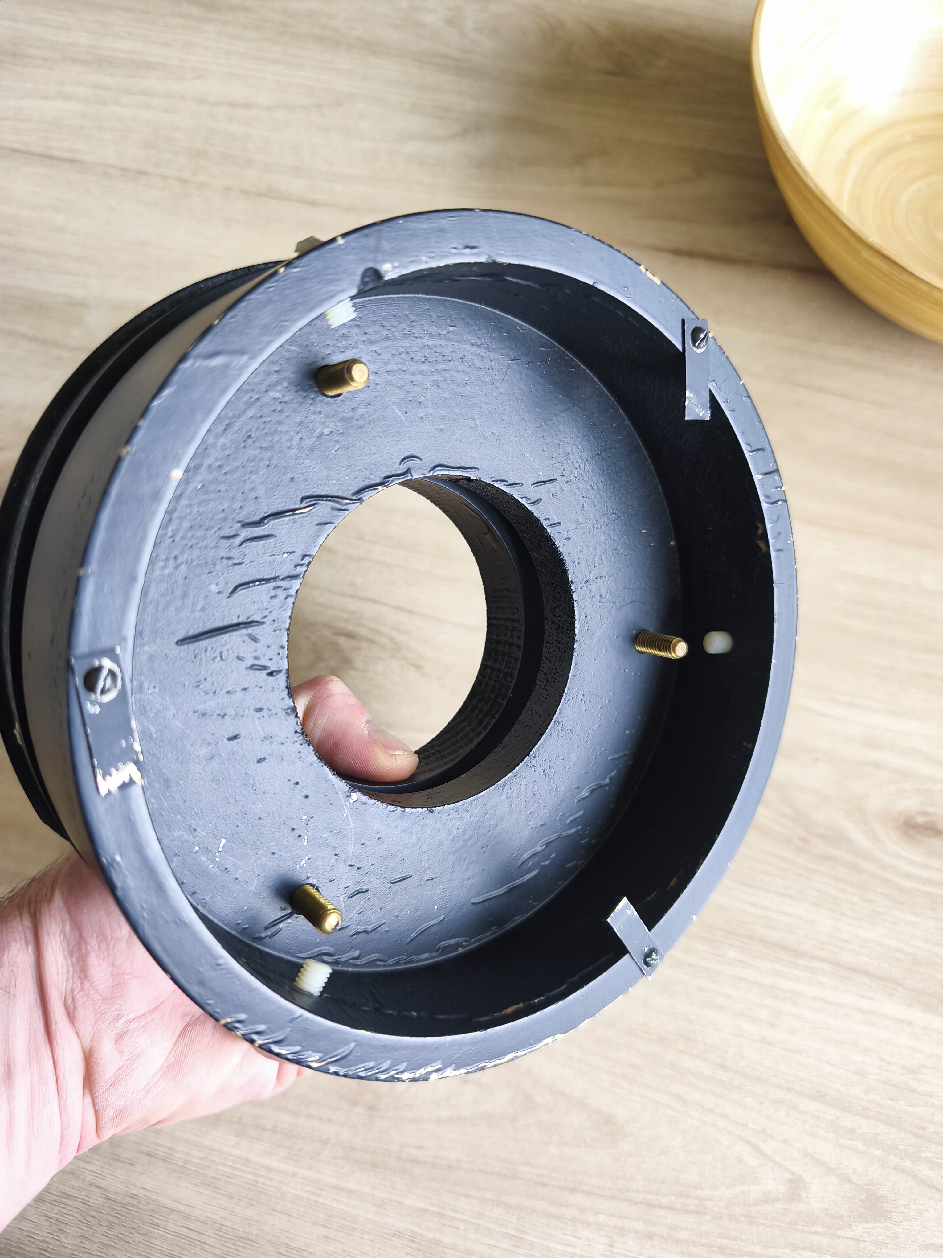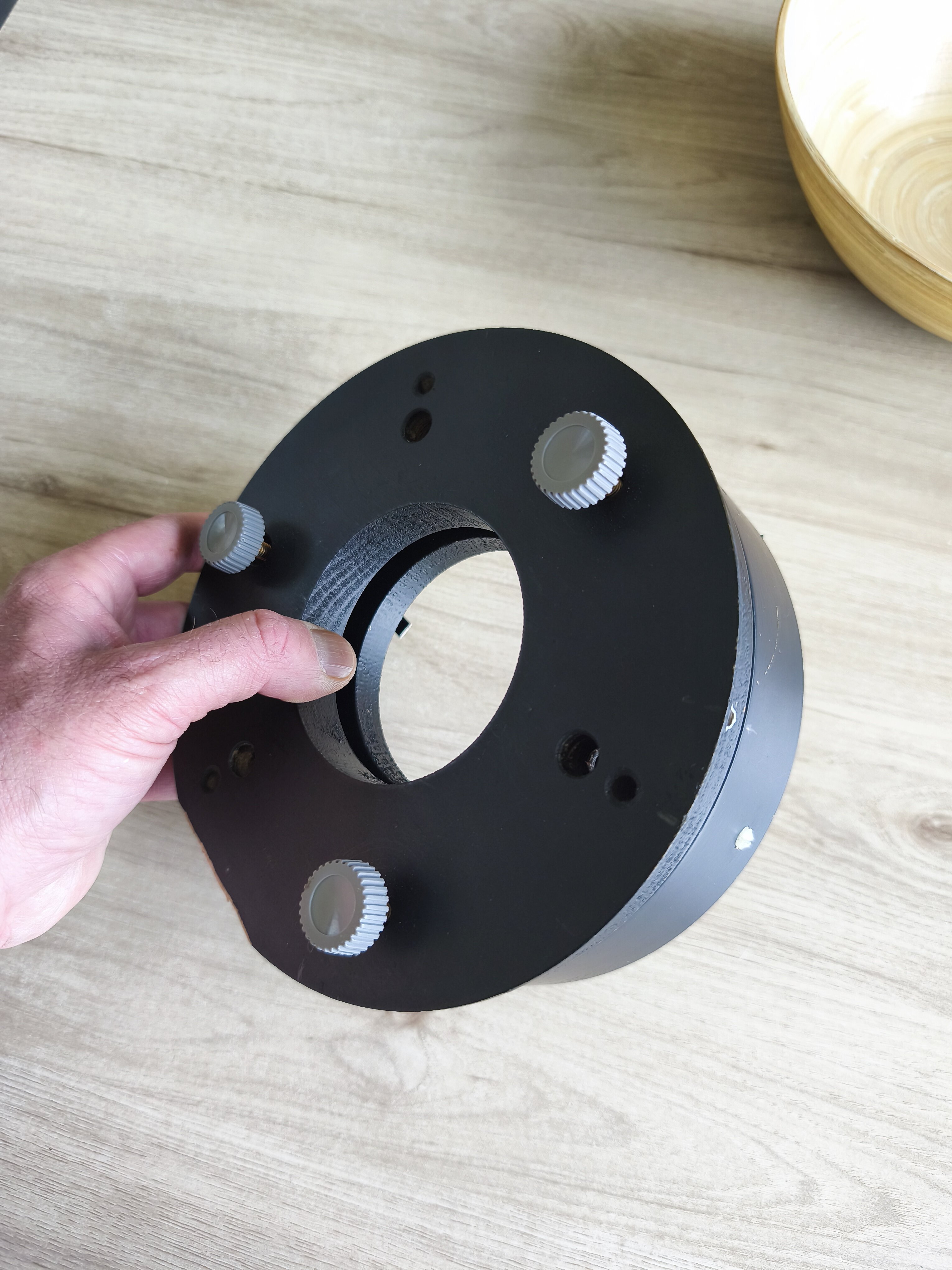 J'ai trouvé une pièce de récup dans mon four tout qui serait intéressante pour faire la jonction tube pvc - crémaillère En plus comme c'est une pièce qui ai faite pour poser un miroir, il y a les 3 visses de collimation qui pourront servir pour régler l'alignement de la crémaillère. Je la fixe sur le tube, je fixe la crémaillère dessus. -