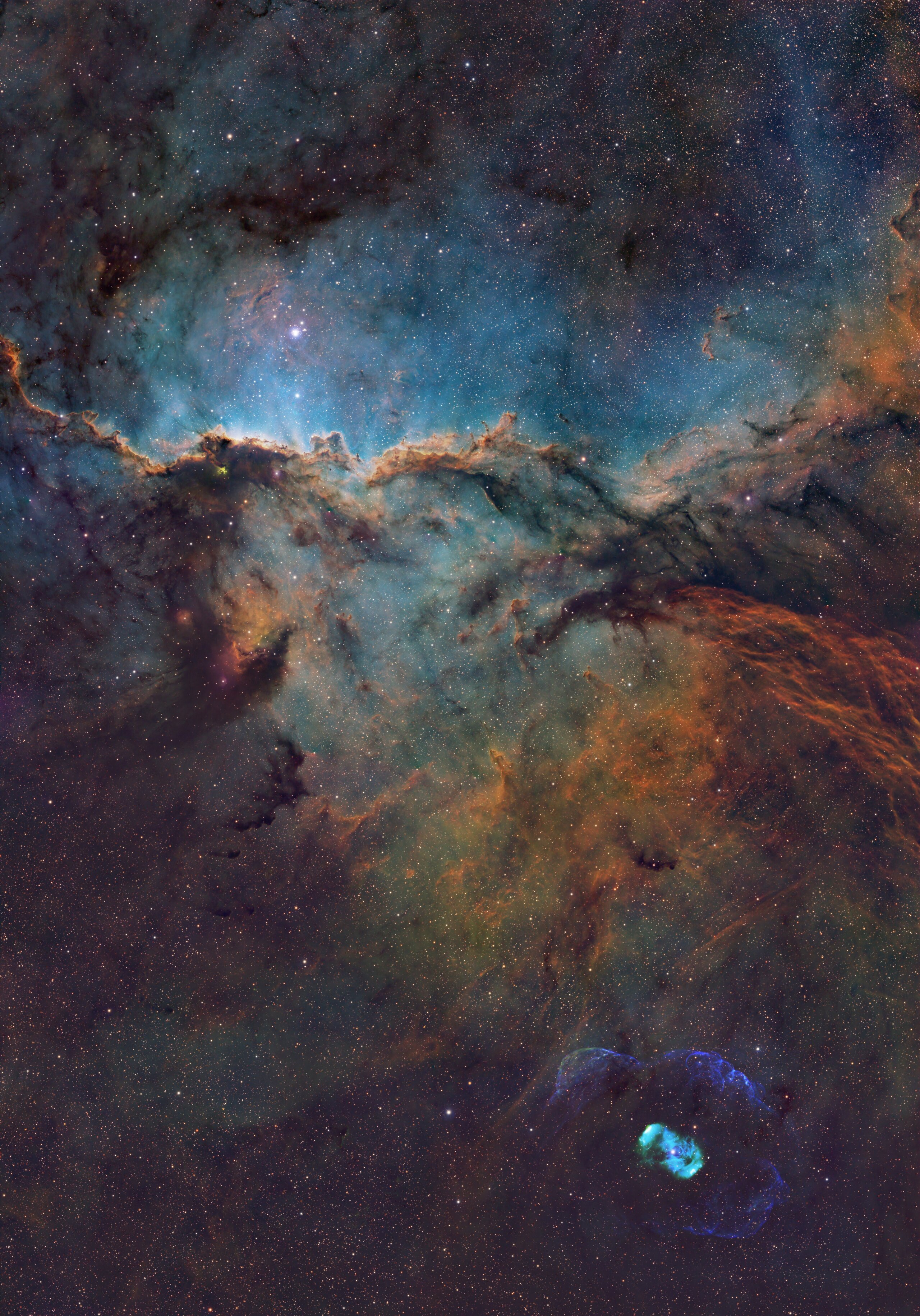 8. Beaucoup de signal ici, effectivement, c'est ue belle image. Avec du SHO, le choix des teintes est toujours difficile, tu n'as pas choisi le SHO traditionel, (le Ha en Vert) , tu a meme probablement fait une "reduction de bruit vert" pour s'en débarrasser, ce qui donne des teintes plus marron, assez differente du SHO classique.