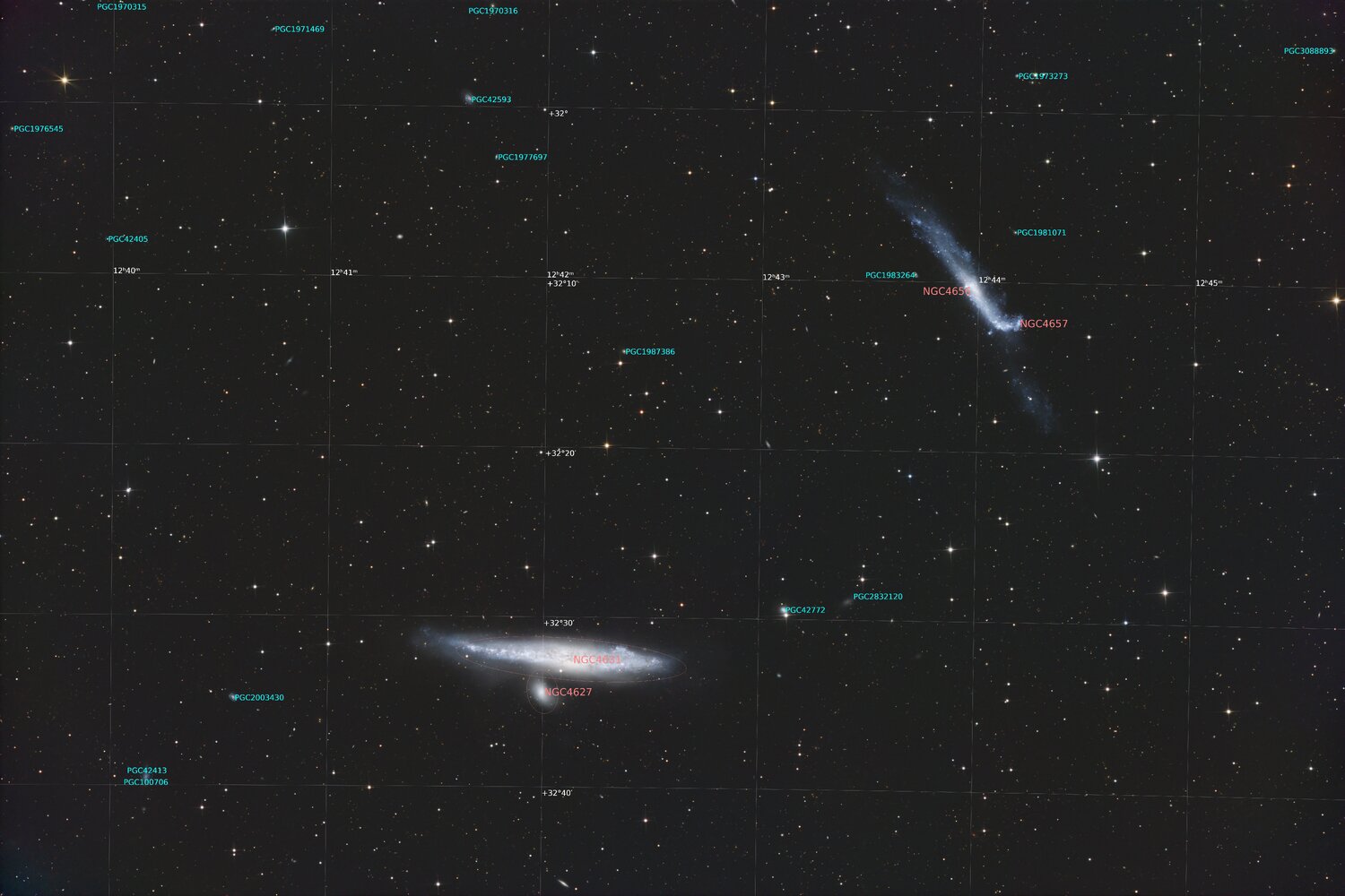 Salut, prises avant hier, NGC4631 et sa copine prises au T350 F4.6. intégration de 44 poses de 240Sec (je me pose pas toutes les questions de Nico @Bross84moi 🤭) Certaines étoiles sont résolues dans les galaxie et on voit ce qu'il semble être une trainée de marré sur NGC4656. Traitement tout simple mais éfficace: GraX SPCC BlurX EZSoft_Stretch Curves NoiseX Color Saturation 5 minutes chrono. l'image: la version annotée: et j'ai un gros faible pour PGC1983264! A vos commentaires a+ Serge