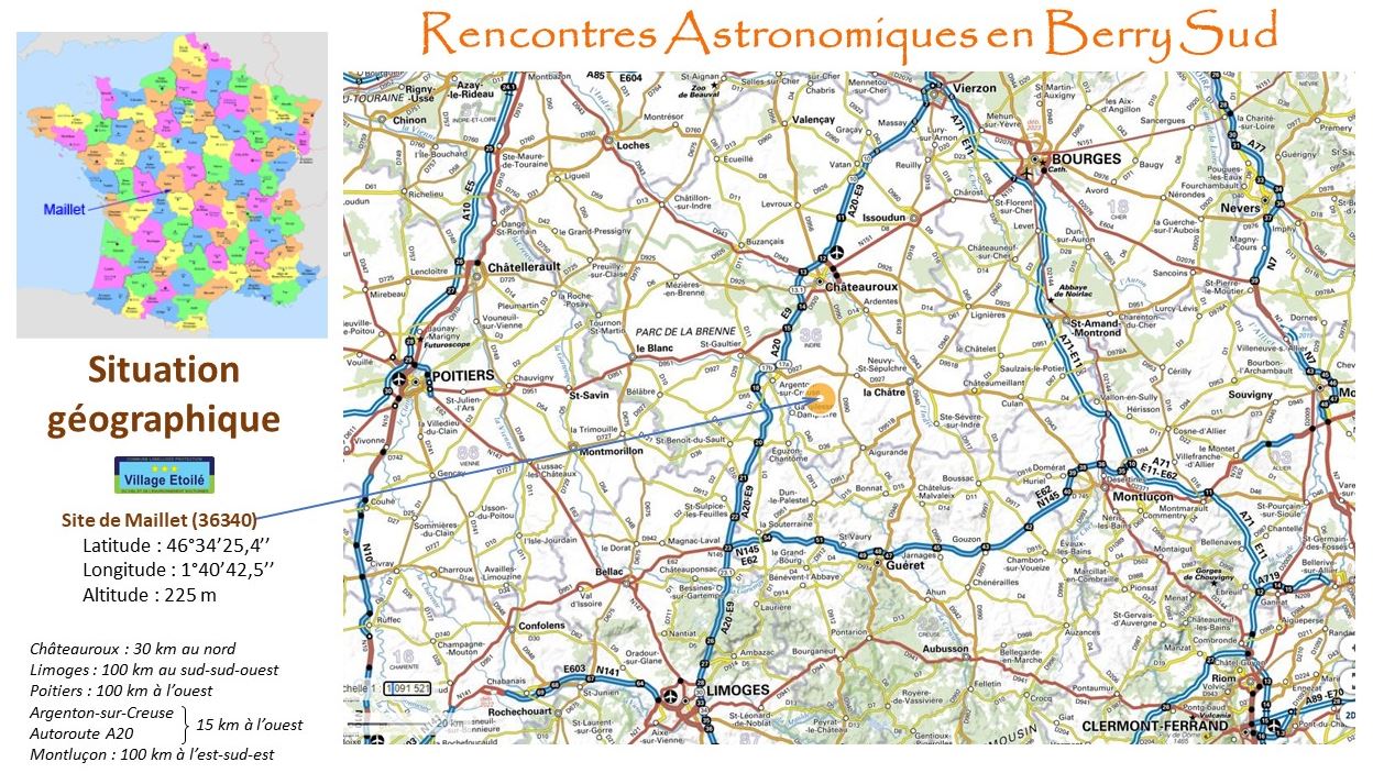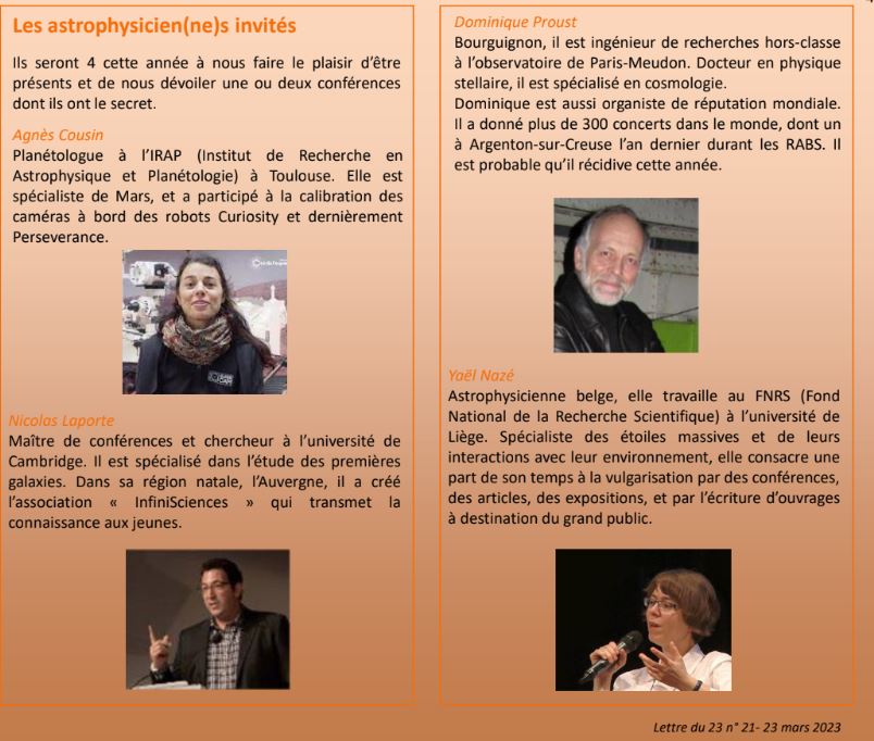 Les clubs Caroline H et Galilée ont le grand plaisir de vous convier à leur 3ème édition des RABS (Rencontres Astronomiques en Berry-sud) qui auront lieu du mercredi 13 au samedi 16 septembre à Maillet (Indre). Soit 4 jours et 4 nuits. Le principe est toujours le même : la moitié du temps (le wk) est partagé avec le grand public. Cette année, nous aurons l'honneur d'accueillir Yaël Nazé, astrophysicienne belge qui rejoindra Agnès Cousin, Nicolas Laporte et Dominique Proust, habitués des RABS. En plus de leurs conférences, viendront s'ajouter celles de certains astrams. Soit une dizaine de conférences. Des expositions et des animations seront également au programme.