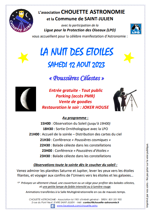 Venez découvrir les merveilles du ciel et échanger, lors d’observations, de conférences et d’animations, avec les astronomes passionnés de l’association Chouette Astronomie.