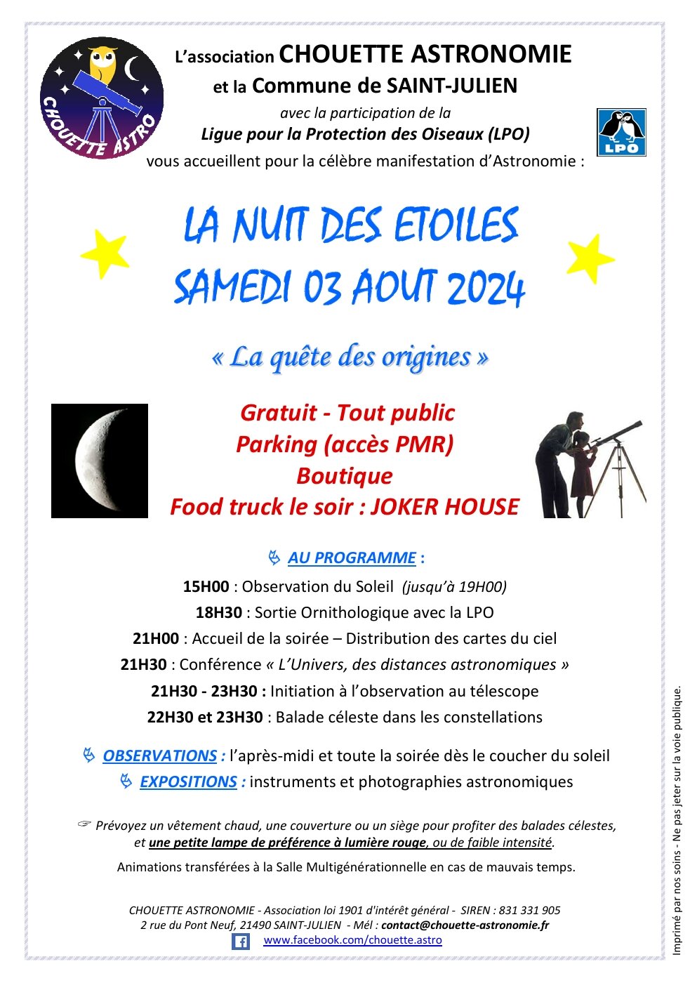 NB : Prévoyez un vêtement chaud, une petite lampe à lumière rouge (ou de faible intensité), et éventuellement un siège ou une couverture, pour profiter pleinement de la soirée.