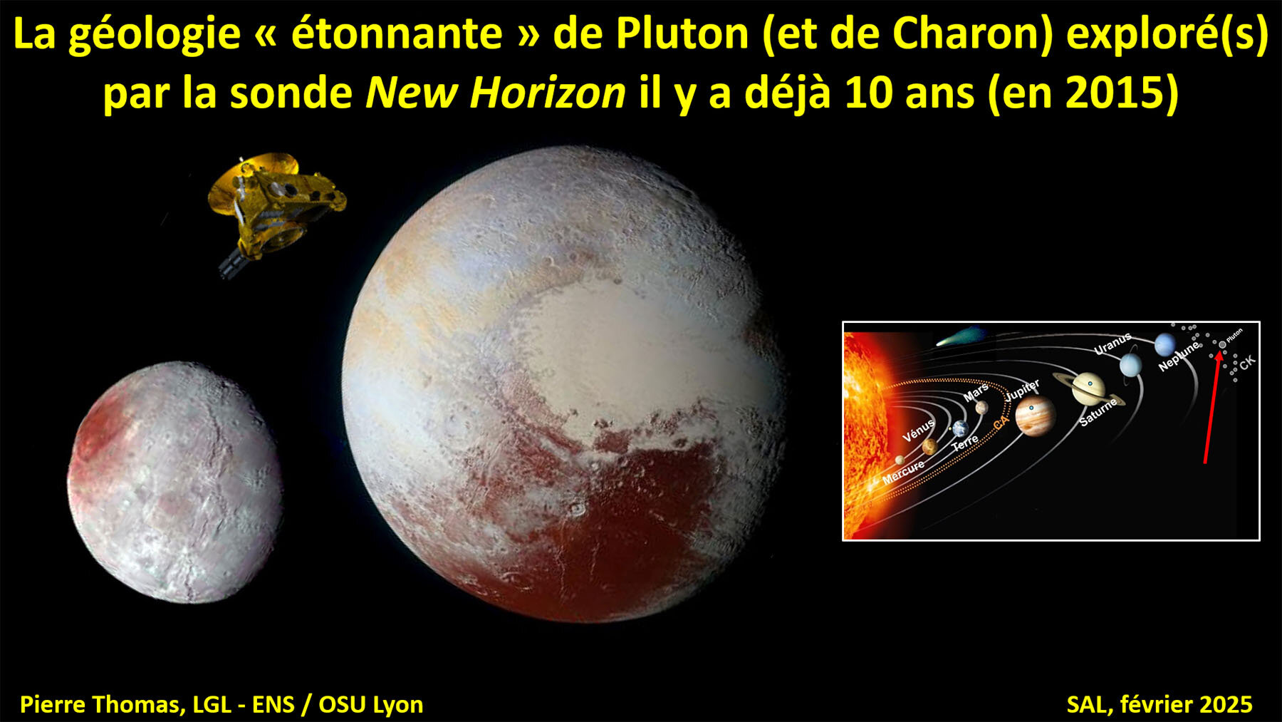 Pluton est une « ex » planète active. La géométrie des failles suggère l'existence d'un océan liquide sous une épaisse couche de glace. L'atmosphère, très ténue, est à l'origine de phénomènes météorologiques uniques dans le système solaire. Cette étrange dynamique atmosphérique serait due aux particularités orbitales originales du couple Pluton-Charon. Et si vous avez aimé les canyons de Mars, vous aimerez Charon, le satellite aux canyons.