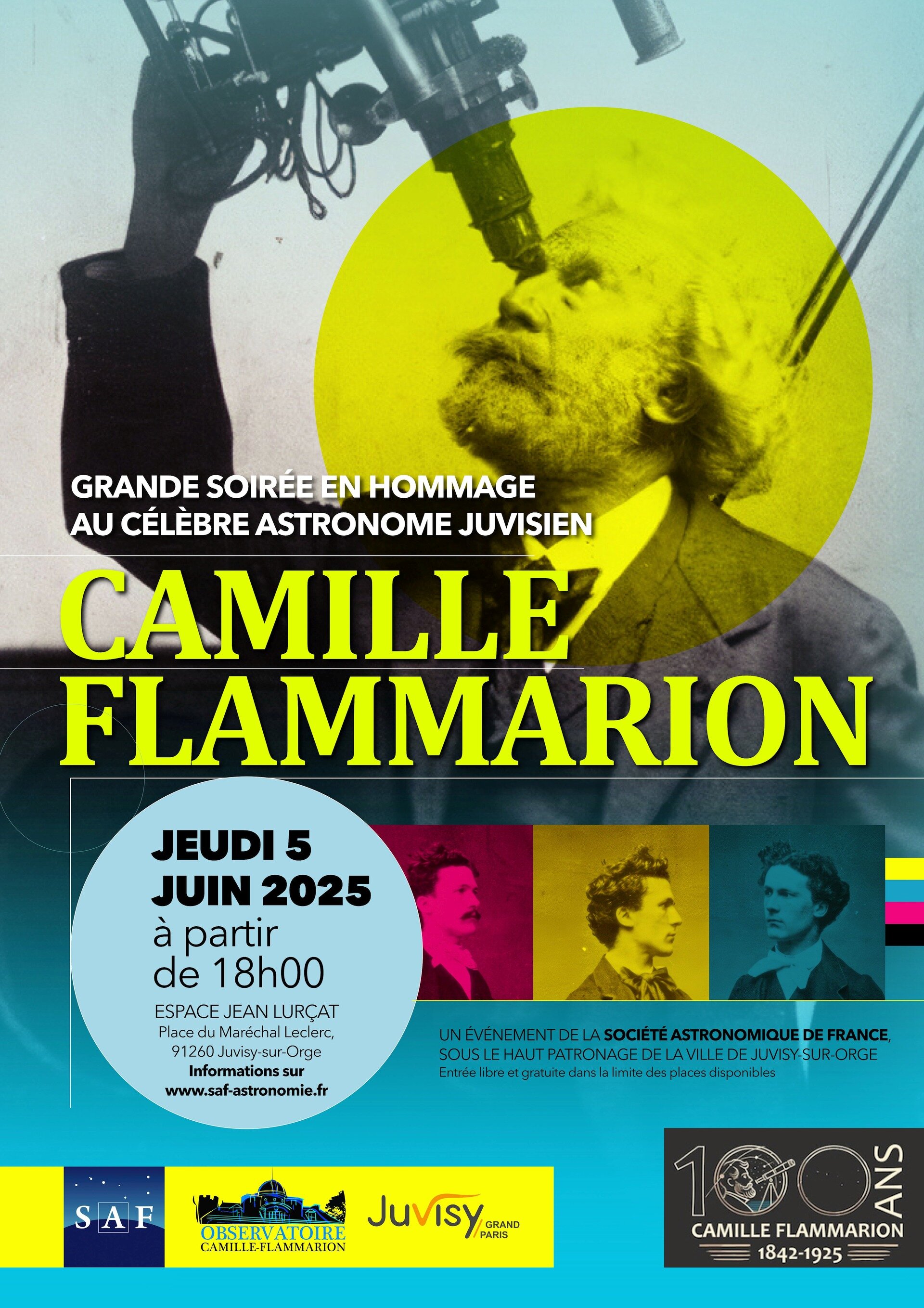 Cette année la Société Astronomique de France commémore le Centenaire de la disparition de Camille Flammarion. Un évènement est prévu jeudi 5 juin à Juvisy, avec expo photo, conférence et débat, qui se veut ouvert à tous.